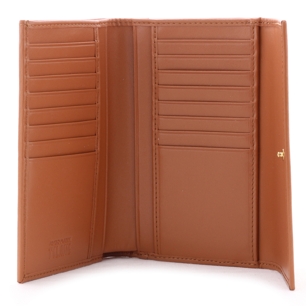Portafoglio donna in tessuto stampa Geo, con interni e rifiniture in vera pelle. Chiusura con bottone. Tasca porta spiccioli esterna chiusa con cerniera. All'interno, scomparti porta carte di credito, tasche porta documenti e reparto porta banconote.