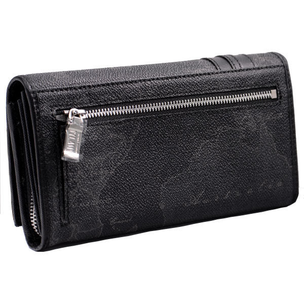 Portafogli donna realizzato in tessuto stampa Geo, con interni e finiture in vera pelle. Chiusura con bottone a clip. Tasca porta spiccioli chiusa con cerniera, scomparti porta carte di credito, tasche porta documenti e reparto porta banconote.
