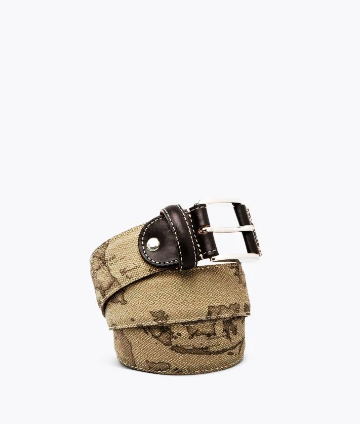 Cintura unisex in tessuto stampato con cartina geografica Geo tortora, fibbia con logo 1° Classe. Un accessorio casual e raffinato, ideale per uomo e donna.