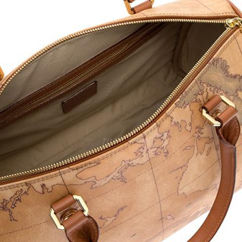 Borsa a bauletto in tessuto stampato con cartina geografica Geo Classic con manici tubolari in pelle color cuoio, metalleria con logo 1AClasse e finiture in oro, chiusura con zip. Presenta i dettagli accurati e le rifiniture preziose tipiche del Made in Italy. Capiente e versatile, saprà adattarsi con stile a tutti i tuoi look.