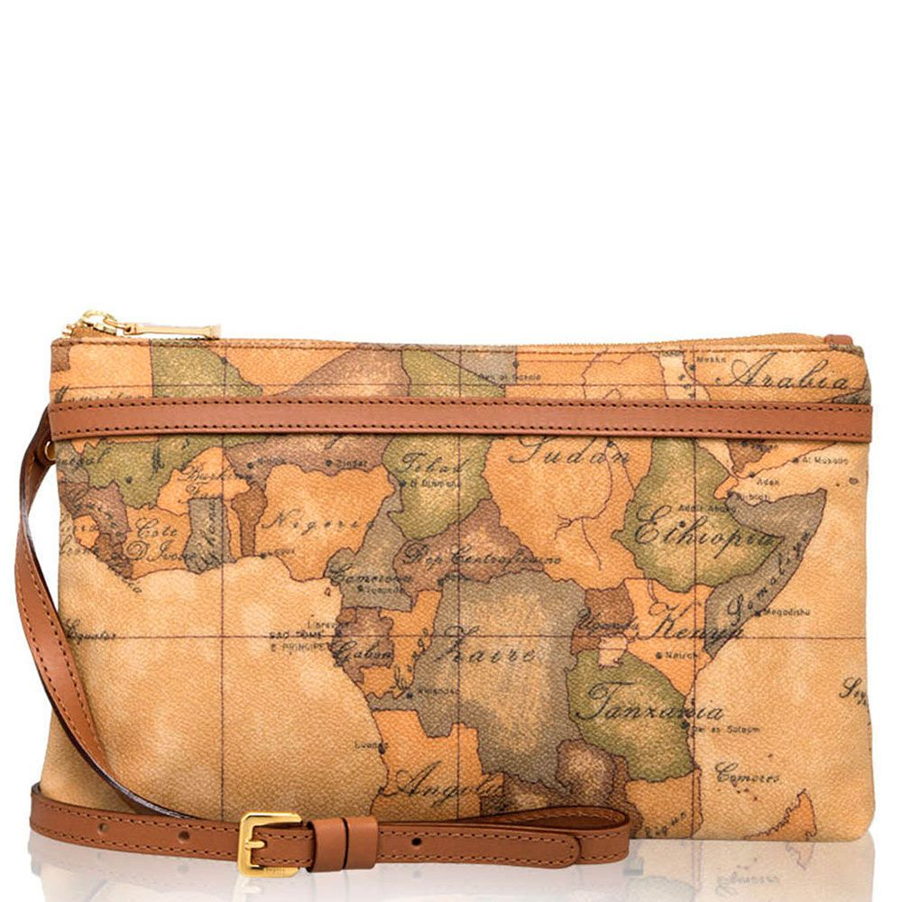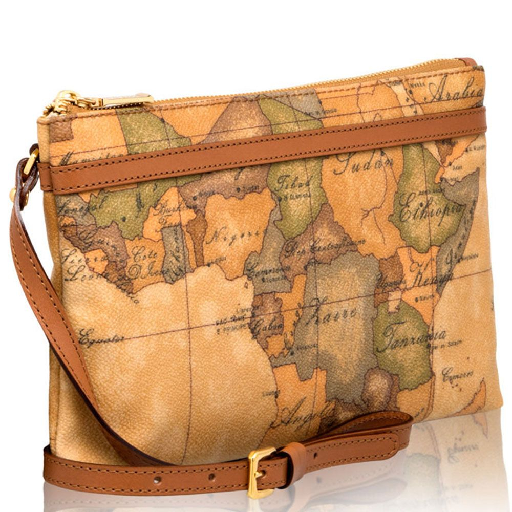 Bandoliera in tessuto stampato con cartina geografica Geo Classic con riporti in pelle di vacchetta color cuoio, metalleria con logo 1AClasse, chiusura con zip. Pratica e ricercata nei dettagli, si abbina perfettamente a qualsiasi outfit.
