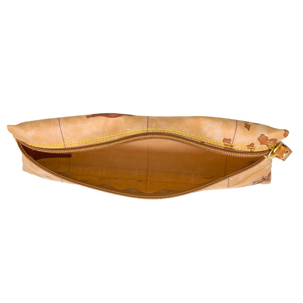 Pochette in tessuto stampato con cartina geografica Geo Soft, con dettagli in pelle di vacchetta color cuoio e chiusura con zip. Perfetta per contenere il tuo make up, può essere comodamente riposta in borsa.