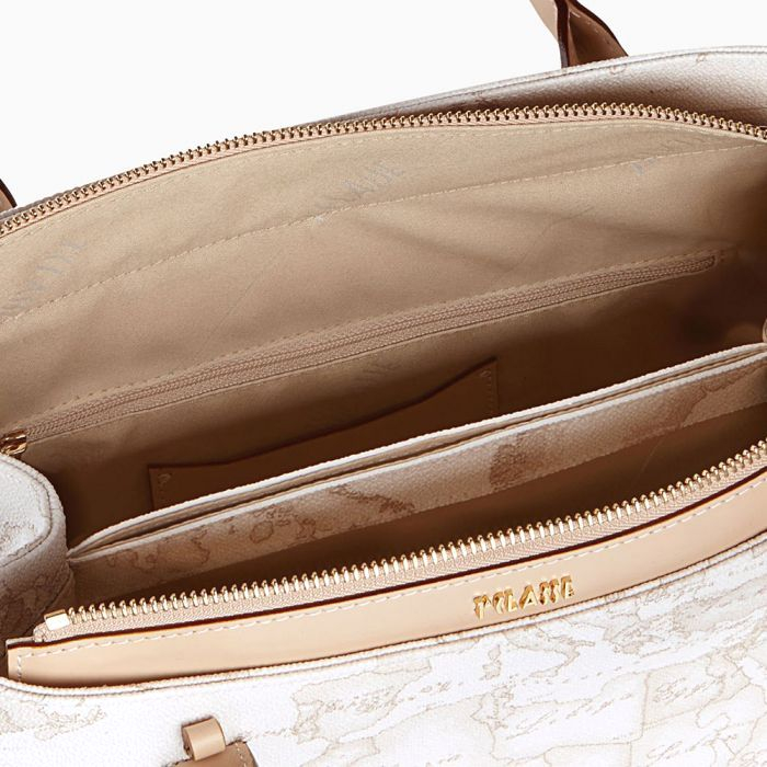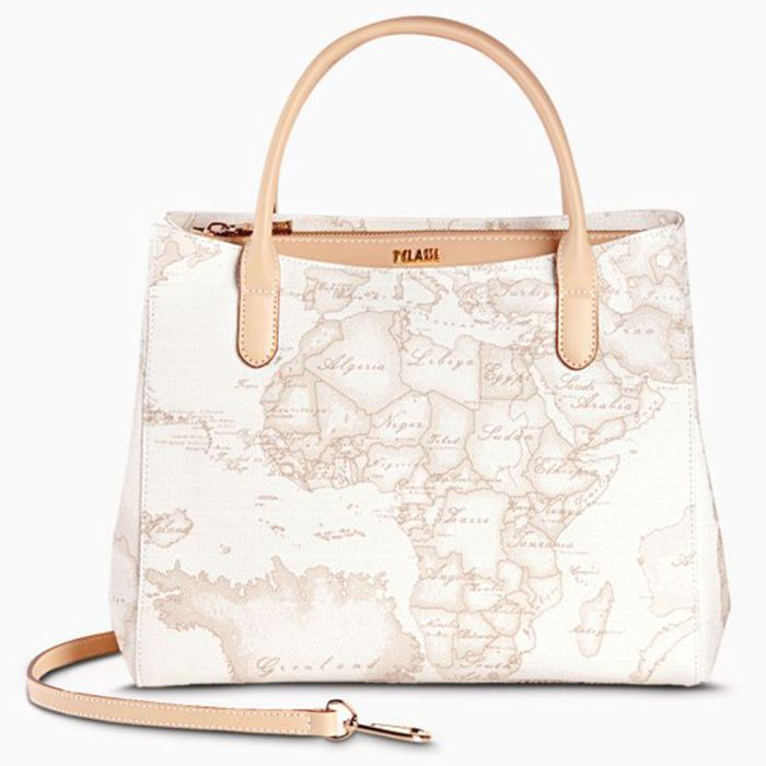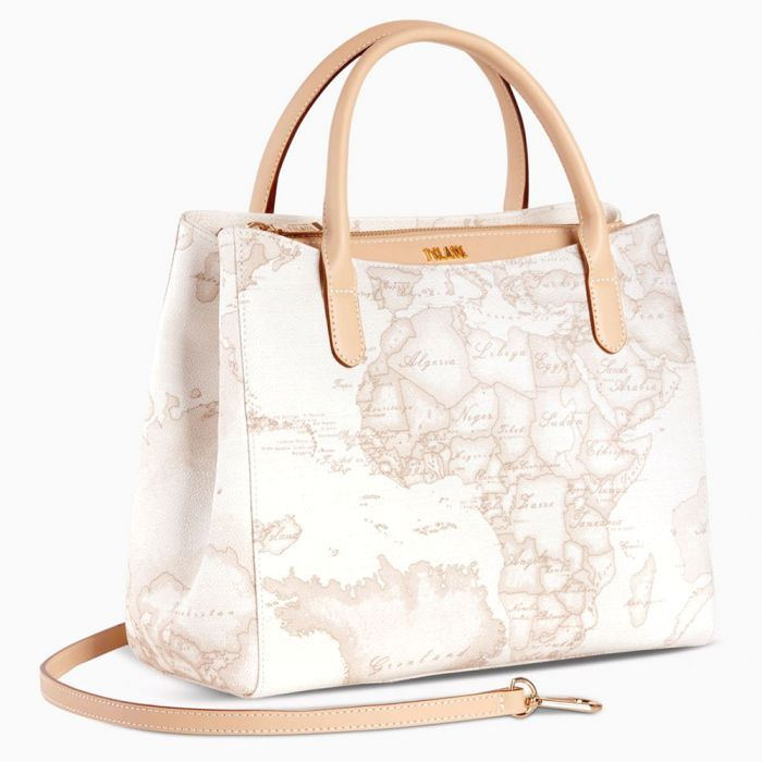 Borsa donna a mano realizzata in tessuto stampa Geo white con finiture in vera pelle. Borsa dalla doppia portabilità, a mano e a tracolla. Con logo lettering 1AClasse in metallo dorato, tre scomparti interni, tracolla removibile e chiusura con zip saprà conquistarti grazie alle dimensioni compatte e ai dettagli ricercati.