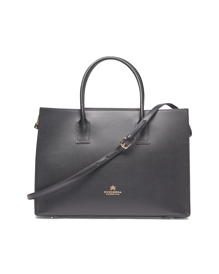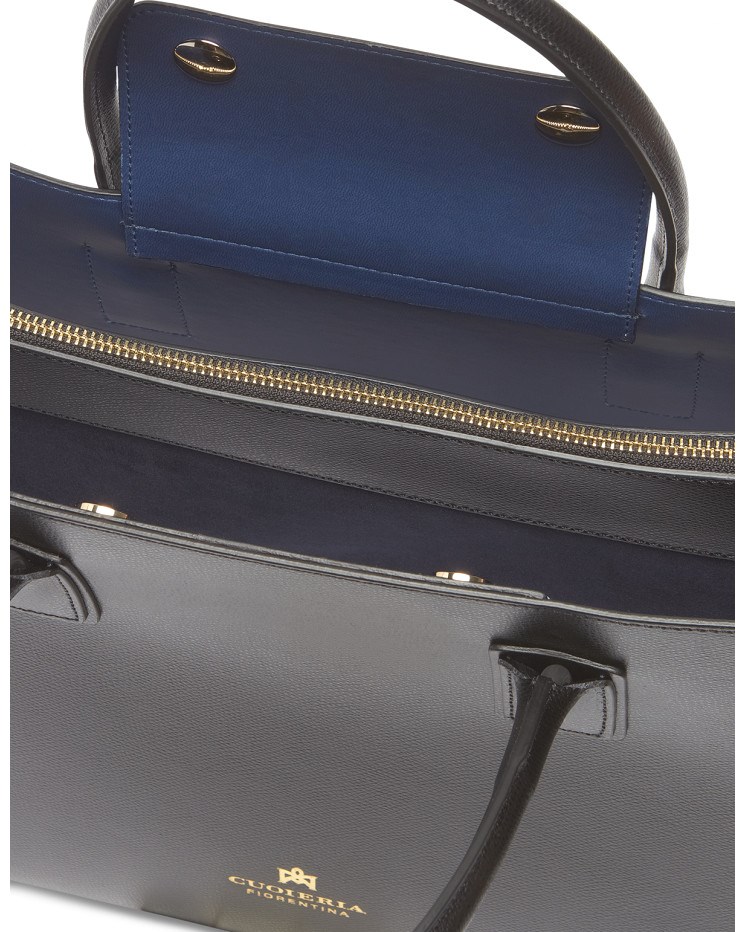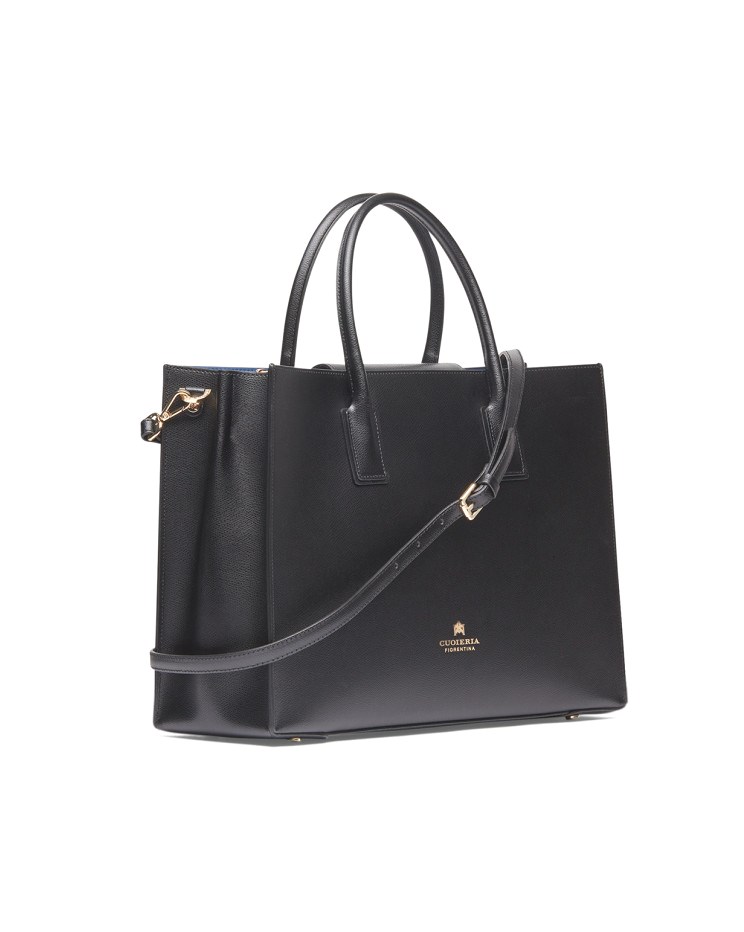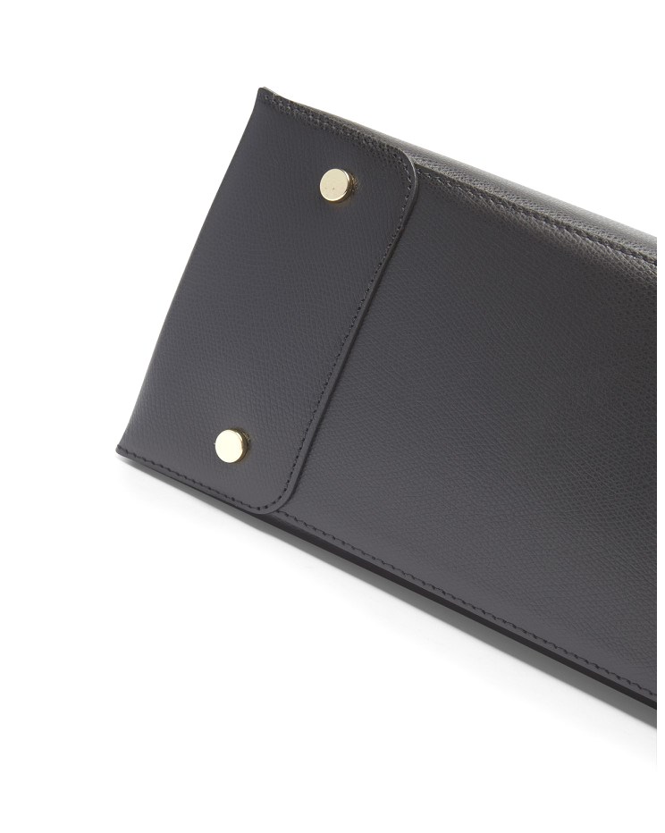 Elegante e sobria, questa grande Tote Alice in vitello palmellato presenta un design solido, sofisticato e compatto con chiusura a doppio bottone e calamita. La rigida silhouette rettangolare è impreziosita dal logo dorato, piedini in metallo e profilo impunturato. L'interno, sfoderato, offre due ampi spazi inframezzati da una sottile tasca verticale chiusa a zip ed è stampato in variante colore, particolare che dona leggerezza e carattere ad una borsa che è ideale in abbinamento sia ad un look disinvolto, che formale. La tracolla rimovibile ed il doppio manico per indosso a mano la rendono un accessorio irrinunciabile ad ogni età. Prodotto finemente realizzato in Italia.