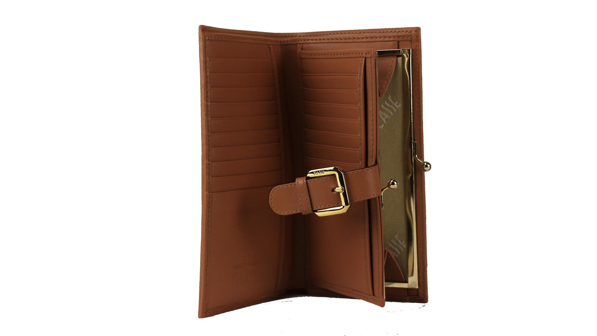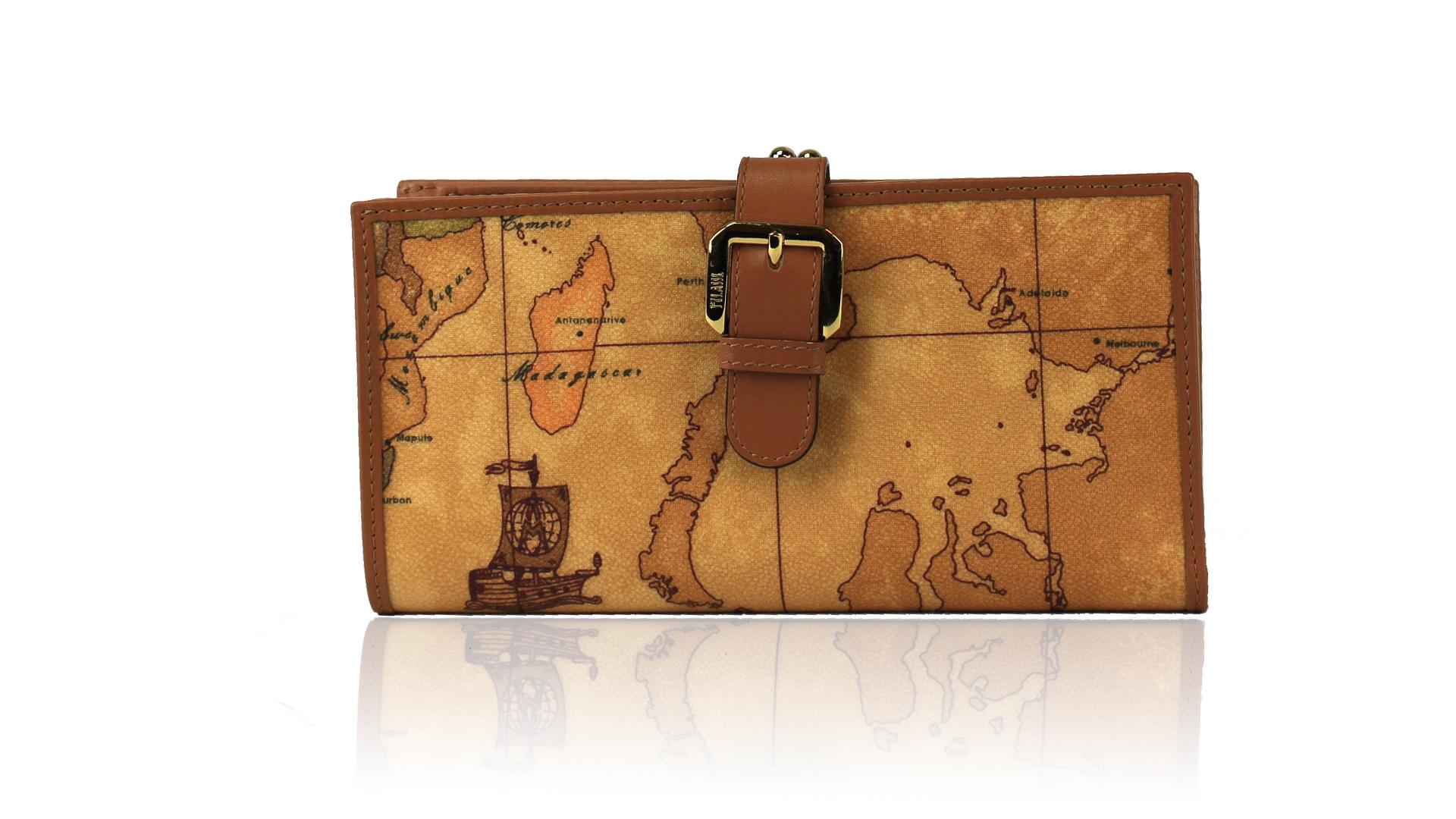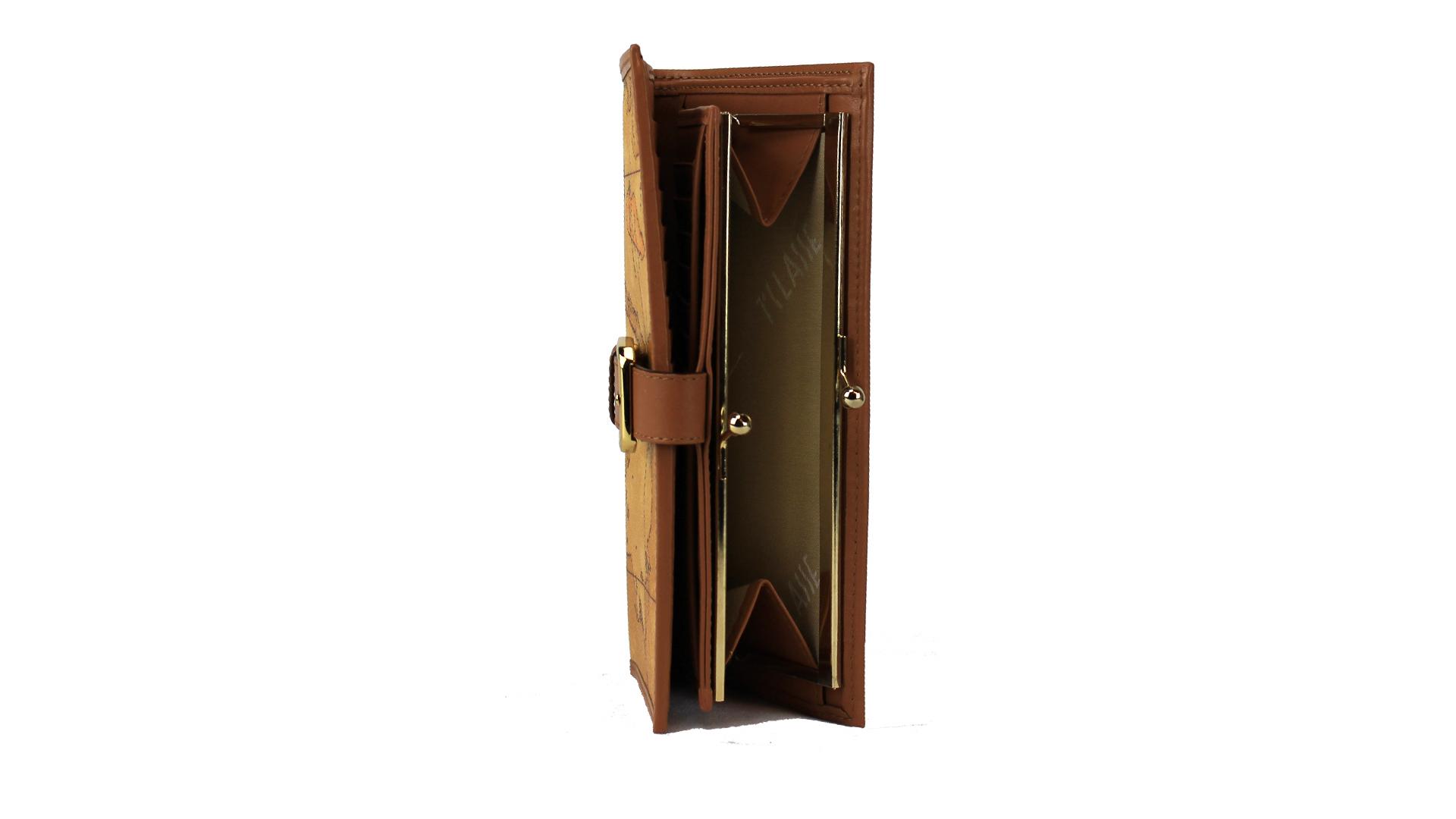 Portafogli donna realizzato in tessuto stampa Geo, con interni e rifinitutre in vera pelle. Chiusura con bottone a clip. Tasca porta spiccioli esterna chiusa con bottone a scatto. All'interno, scomparti porta carte di credito, tasche porta documenti e reparto porta banconote.