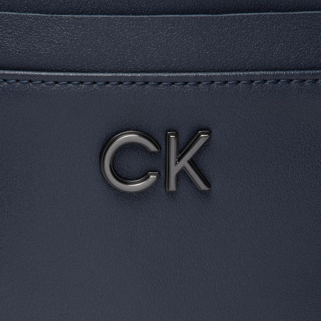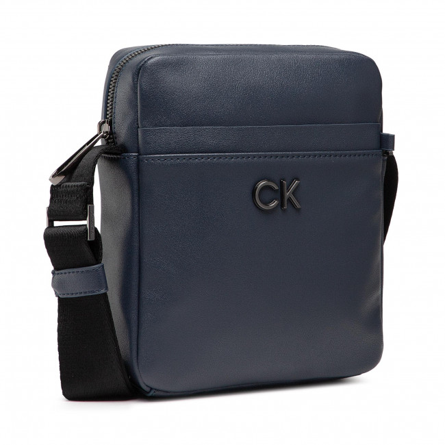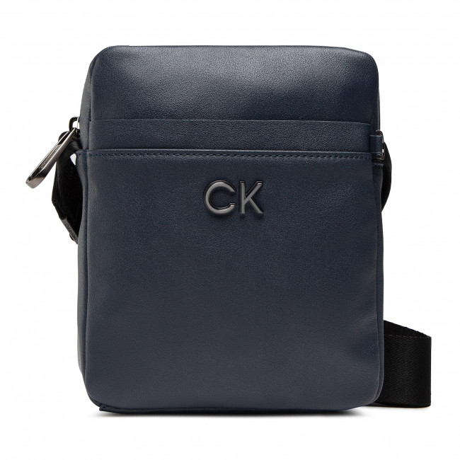 Borsello CK in ecopelle riciclata blu con tasca anteriore e logo metallico in rilievo in acciaio brunito.