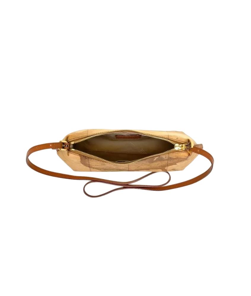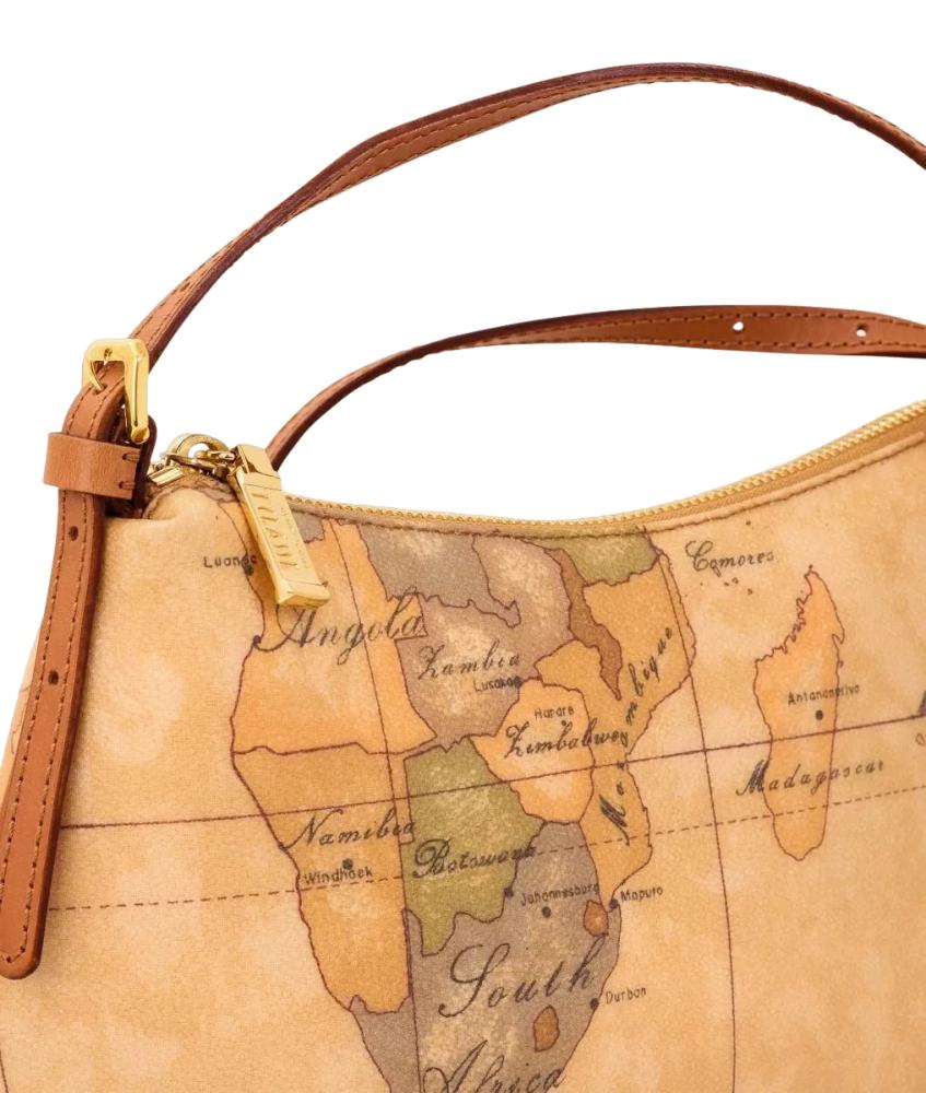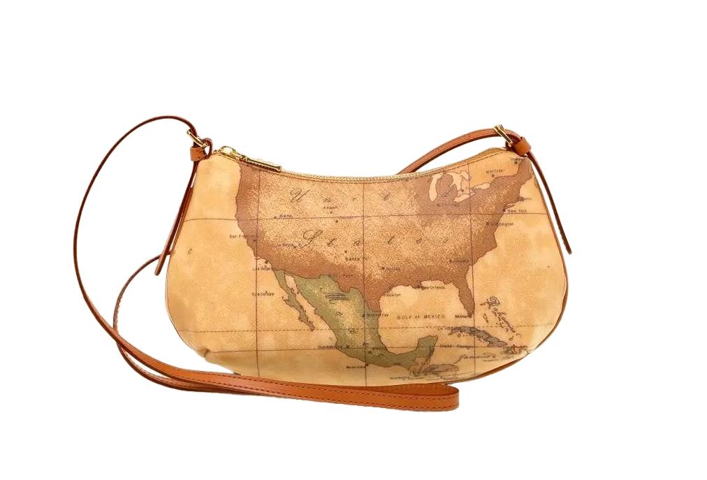 Borsa a tracolla in tessuto stampato con cartina geografica Geo Classic, con tracolla regolabile con fibbiette, chiusura con zip, dettagli in pelle di vacchetta color cuoio. Lineare e femminile, è ideale per rifinire i tuoi outfit con un tocco di stile.