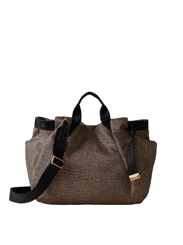 - Il nastro logato di tessuto riciclato cucito lungo il bordo si trasforma nell'impugnatura a doppio manico