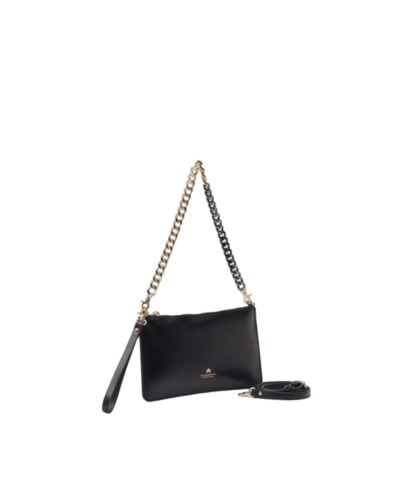Una piccola borsa dal design lineare ed elegante che si fa glam. Lo spazio al suo interno permette di portare con sé l'indispensabile nelle serate con le amiche. Il pellame, resistente e dal colore pieno, è illuminato da inserti dorati. Comodissima da indossare a spalla con la leziosa catena color oro, si può trasformare in pochette durante gli aperitivi con il comodo bracciale. La pouch Bella è perfetta per la donna che non vuole passare inosservata.