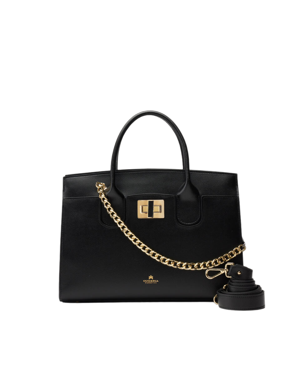 Raffinata e preziosa, la large tote Bella esprime la propria eleganza attraverso un design solido e luminosi inserti dorati. Ideale per donna impegnata tra lavoro e appuntamenti personali, ha gli spazi perfetti per contenere comodamente l'essenziale, il laptop e la trousse per il trucco in vista di una cena con i colleghi. Bella fa della classe il punto di forza: tutto lo spazio che serve, tutto lo stile che serve.