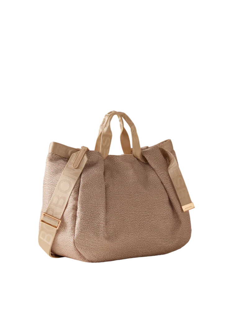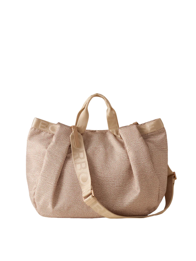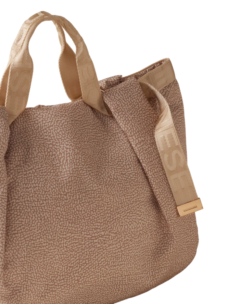 - Il nastro logato di tessuto riciclato cucito lungo il bordo si trasforma nell'impugnatura a doppio manico