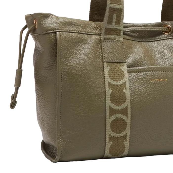 Coccinelle 2day Signature è una shopping in perfetto stile metropolitano, capace di accompagnare la donna Coccinelle durante tutta la sua giornata. Silhouette essenziale e geometrica, questa shopping può essere indossata a spalla grazie ai comodi manici caratterizzati dal nastro logato che completano il design con una nota iconica. Una maggiore funzionalità è data dalle coulisse laterali e dalla tasca frontale. Questo modello è realizzato in pelle lavorata tramite specifici macchinari e poi bottalata al fine di mantenerne la morbidezza. È una pelle molto resistente che si presta a una facile pulizia, ideale per un uso quotidiano.