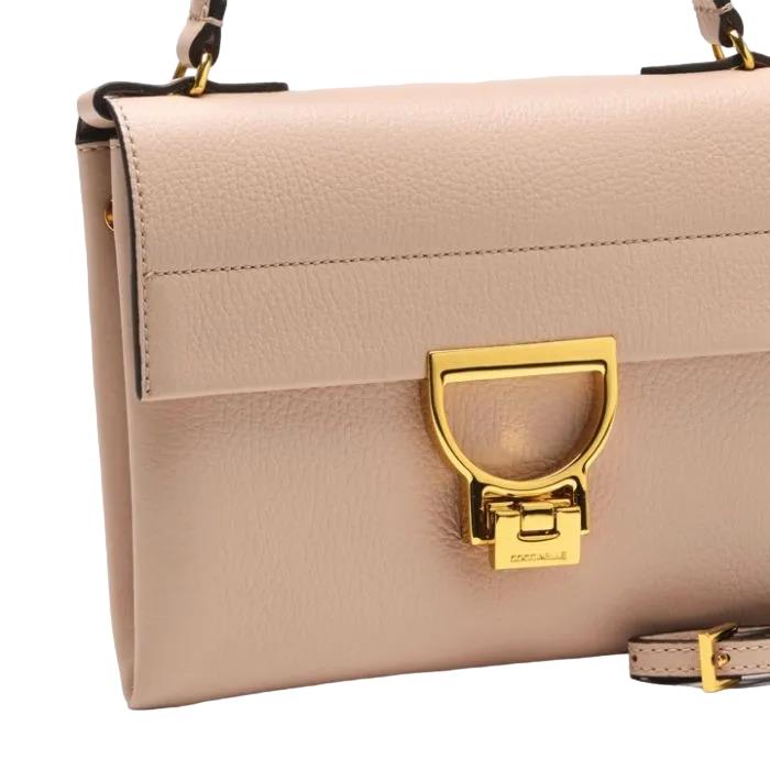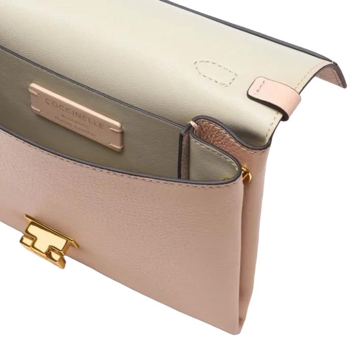 Tratto distintivo della linea Arlettis è la fusione del gusto retrò a quello degli anni ’70, per una donna eclettica e femminile. La chiusura, rielaborazione grafica di una lettera C rovesciata, crea continuità con gli elementi distintivi di Coccinelle . Combinazione di modernità ed eleganza, questo nuovo modello della linea Arlettis è una perfetta clutch estremamente versatile. Dotata di tracolla per una doppia portabilità, risulta ideale per ogni occasione speciale. Questo modello è realizzato in pelle lavorata tramite specifici macchinari e poi bottalata al fine di mantenerne la morbidezza. È una pelle molto resistente che si presta a una facile pulizia, ideale per un uso quotidiano.