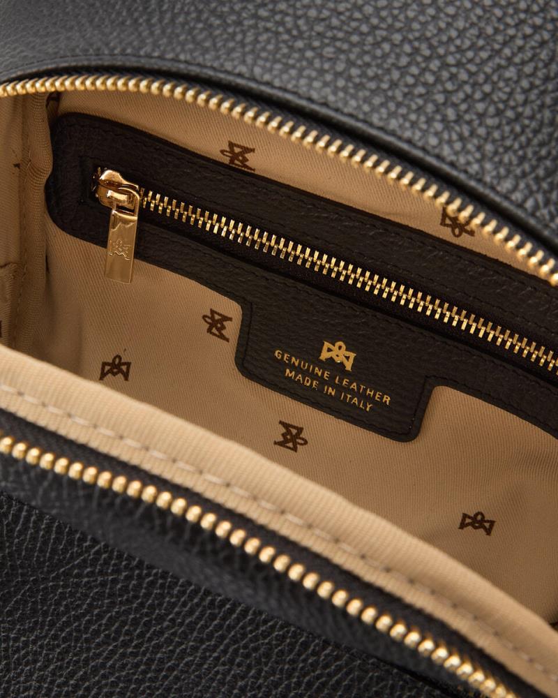 - Dettagli esterni: tasca frontale con chiusura a zip e logo stampato a fuoco colore oro.