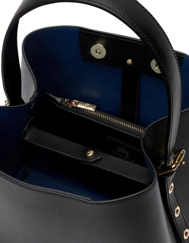 Sobrio e dal look lineare, il bucket Alice è pratico in ogni occasione quotidiana. Per la donna che non sta mai ferma, dalle riunioni di lavoro allo shopping pomeridiano, la silhouette del secchiello si fa morbida con alcuni inserti dorati. Il suo richiamo comodo e senza tempo lo rendono compagno perfetto durante un cocktail con le amiche o una normale giornata di lavoro. Lo stile senza rinunciare alla praticità.