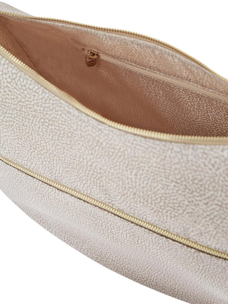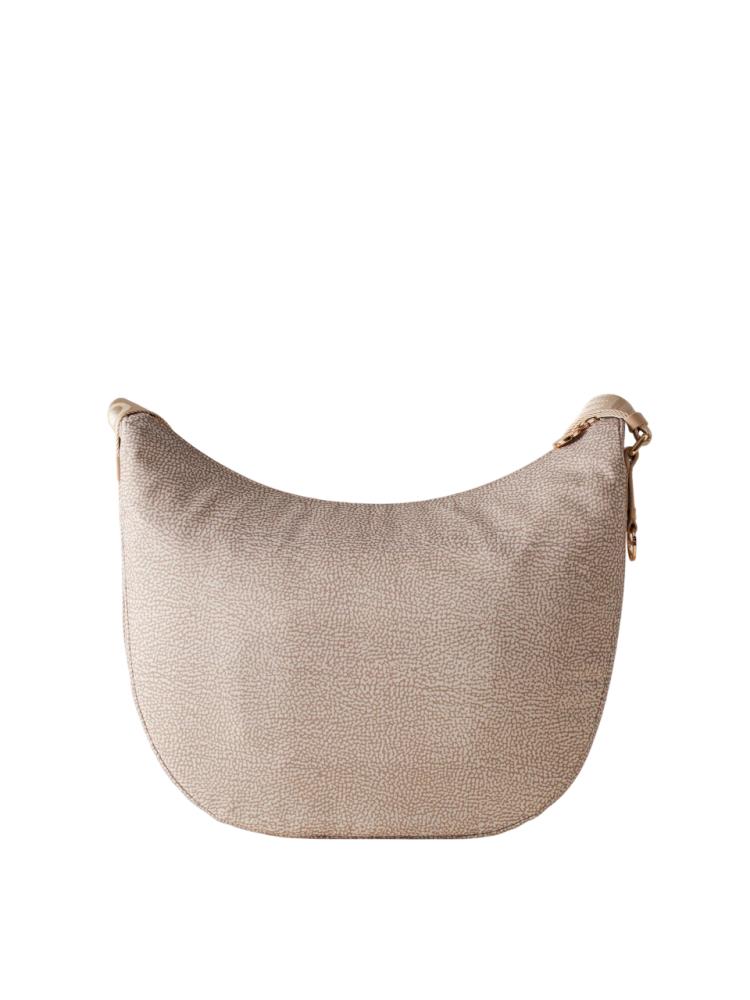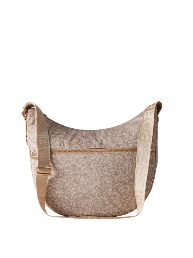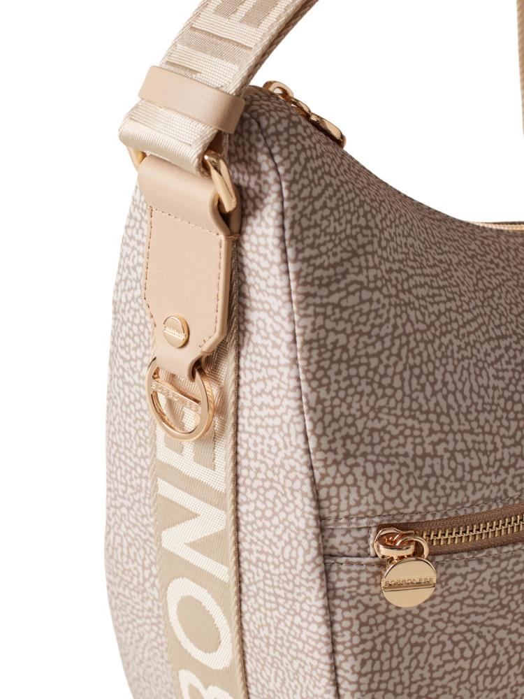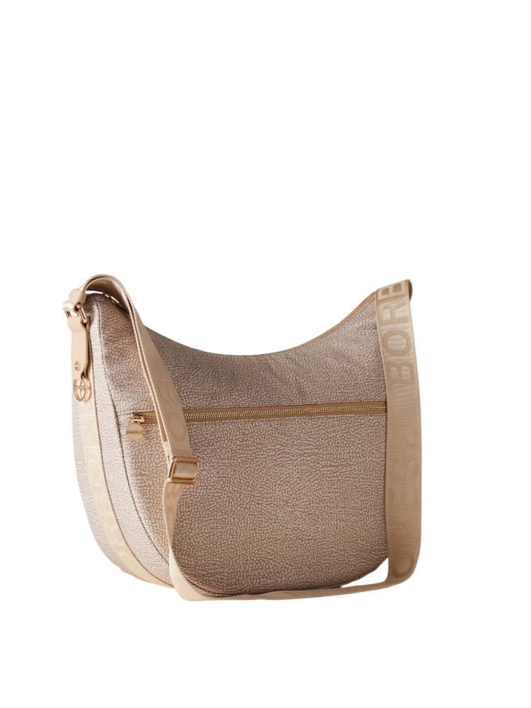 L'iconica Luna Bag Medium di Borbonese è una "hobo" realizzata in nylon jet op con dettagli di pelle e nastro di nylon logato all around. La tracolla, regolabile, è in nastro di nylon logato con fibbia autobloccante. La chiusura principale e quella della tasca esterna sono garantite da una zip con tiralampo a forma di vite stilizzata, simbolo del brand. L'interno, foderato in tessuto jacquard, ha tre tasche di cui una con zip. Le metallerie sono in galvanica oro chiaro.