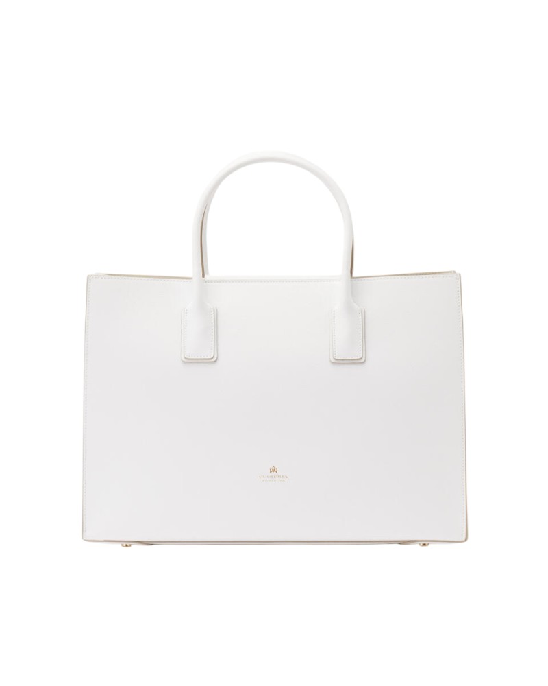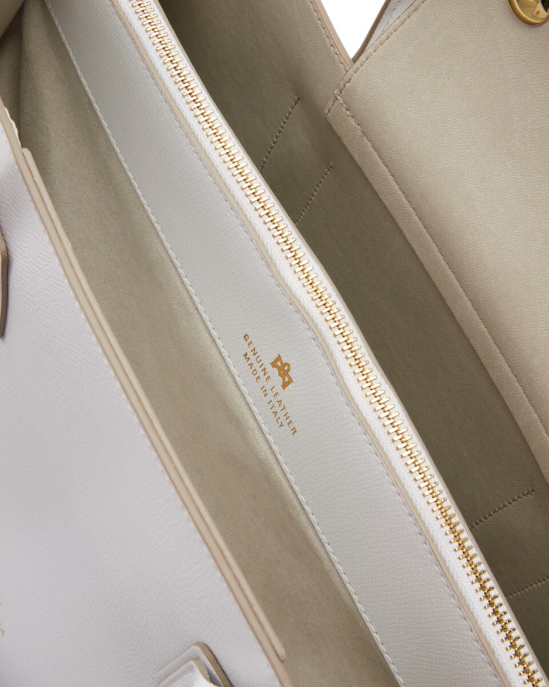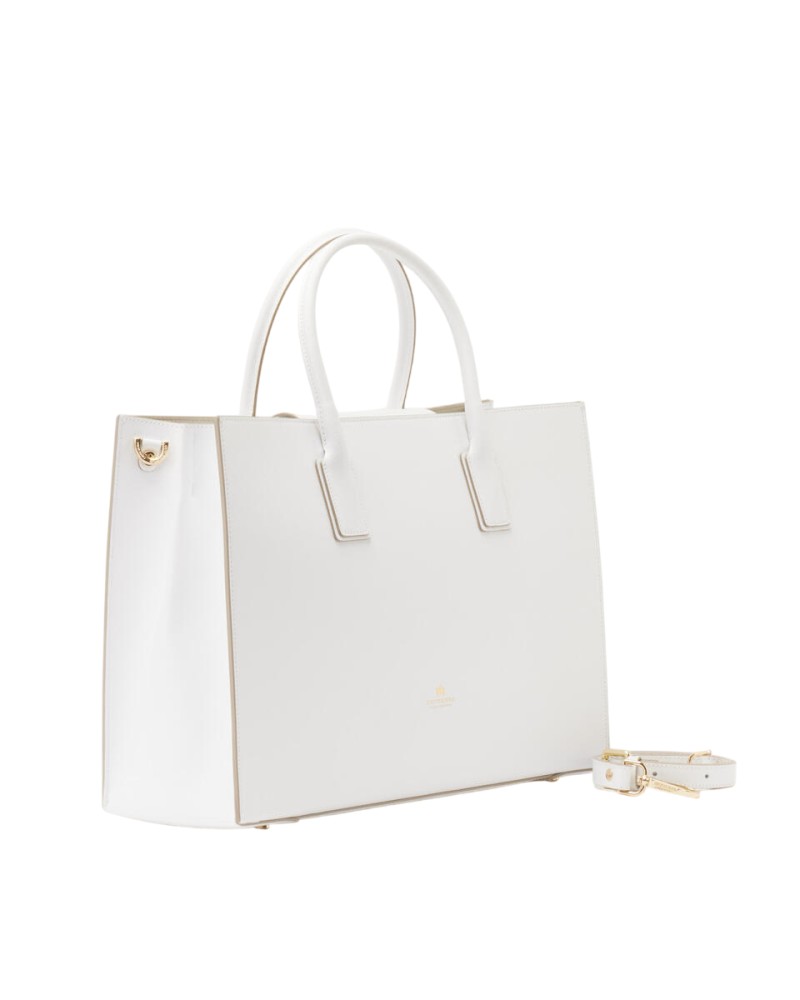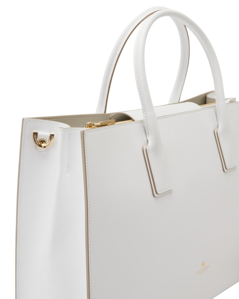 Elegante e sobria, questa grande Tote Alice in vitello palmellato presenta un design solido, sofisticato e compatto con chiusura a doppio bottone e calamita. La rigida silhouette rettangolare è impreziosita dal logo dorato, piedini in metallo e profilo impunturato. L'interno, sfoderato, offre due ampi spazi inframezzati da una sottile tasca verticale chiusa a zip ed è stampato in variante colore, particolare che dona leggerezza e carattere ad una borsa che è ideale in abbinamento sia ad un look disinvolto, che formale. La tracolla rimovibile ed il doppio manico per indosso a mano la rendono un accessorio irrinunciabile ad ogni età. Prodotto finemente realizzato in Italia.