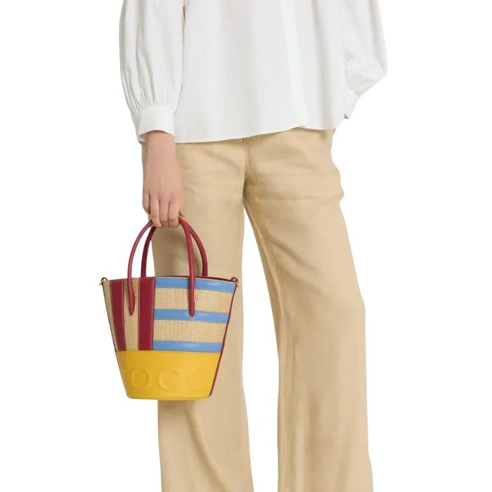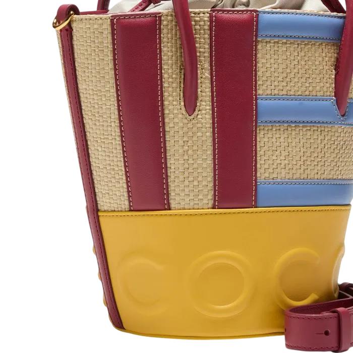 Coccinelle Myrtha è un secchiello di cui non puoi fare a meno, pratico e di tendenza caratterizzato dal maxi logo «Coccinelle». Perfetto per un utilizzo quotidiano anche grazie alla chiusura con coulisse e dal comparto interno che consente di organizzare in maniera ottimale tutto il necessario. Questo modello è realizzato in strisce di pelle liscia di diverse dimensioni applicate in verticale ed orizzontale su base paglia.