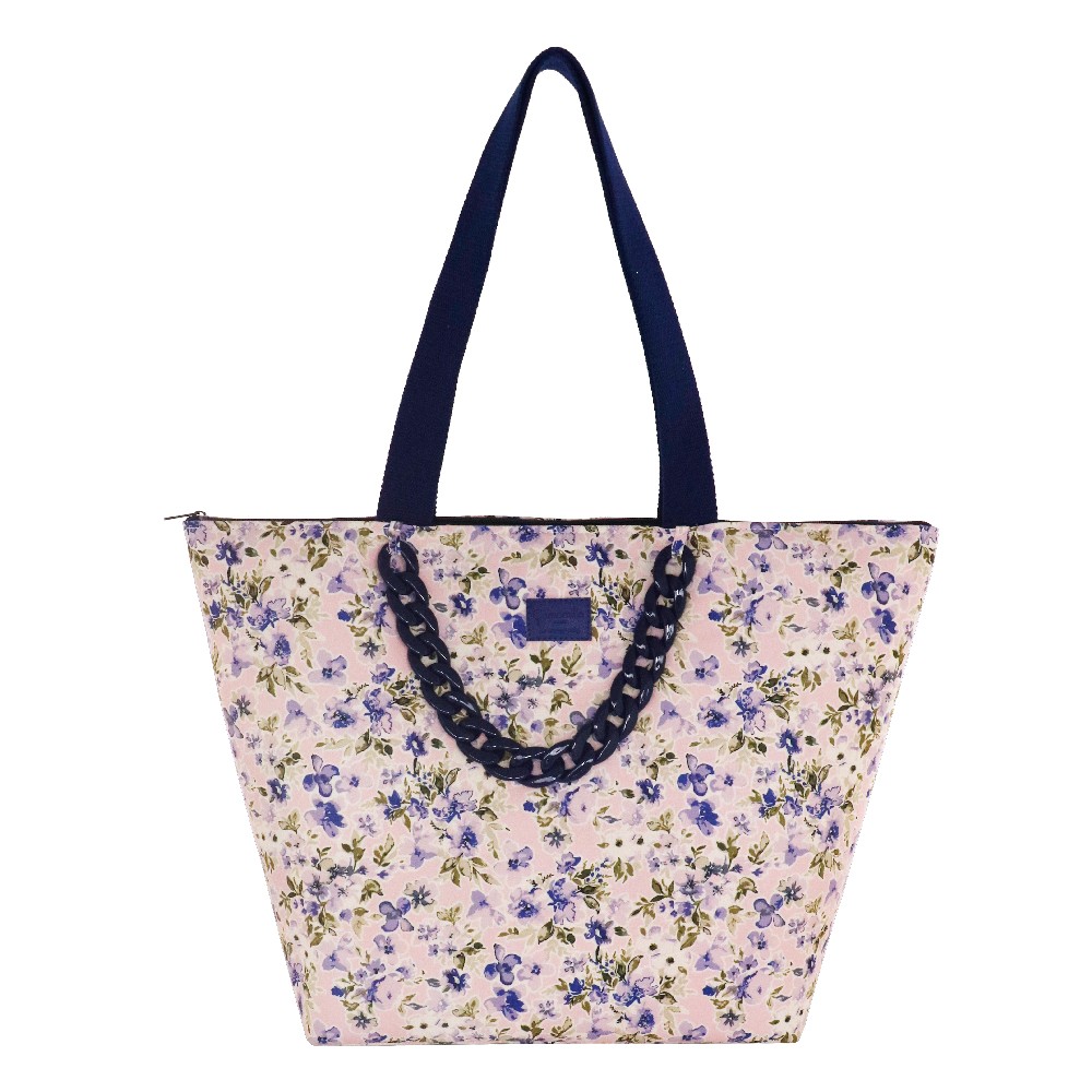 BORSA MARE L CATENA FIORI in tessuto a fiori. Manici e catena a contrasto.