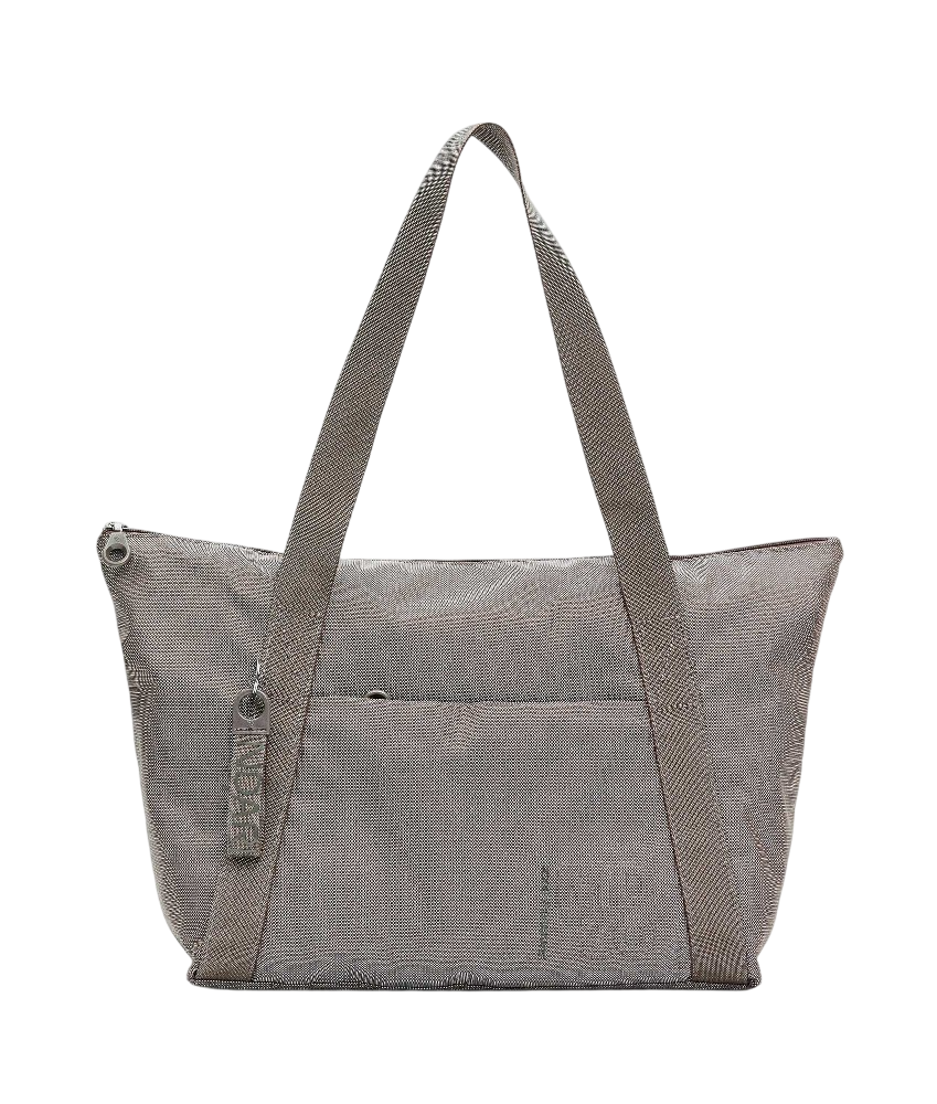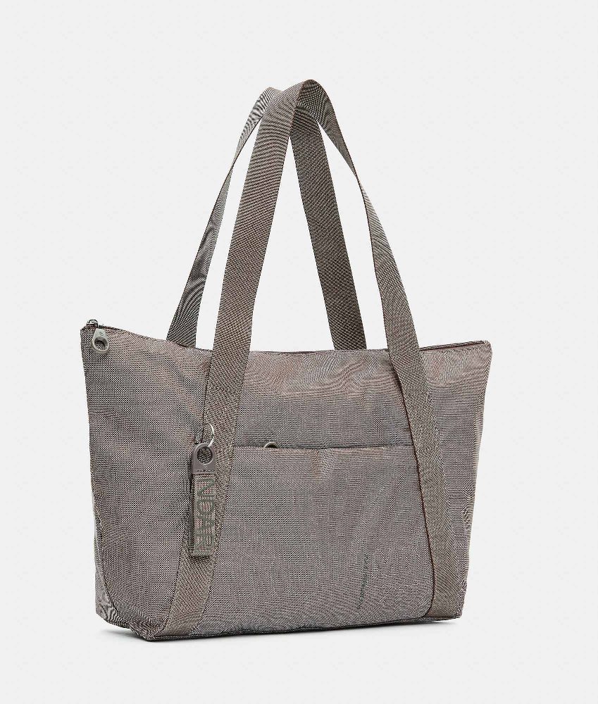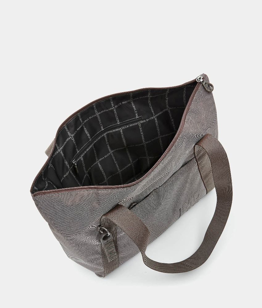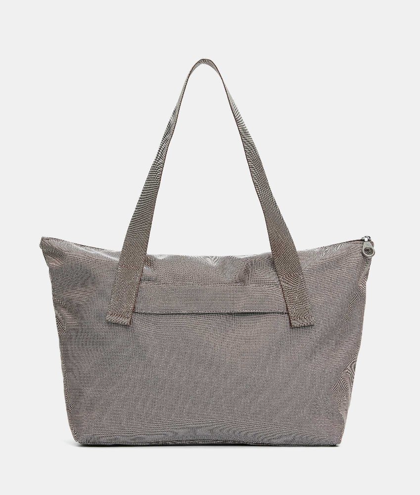 Shopper pieghevole in Tessuto con tasca frontale con zip. Tasche funzionali, dettagli personalizzati, cinghia interna per la piegatura e cinghia posteriore per l'inserimento nel trolley.