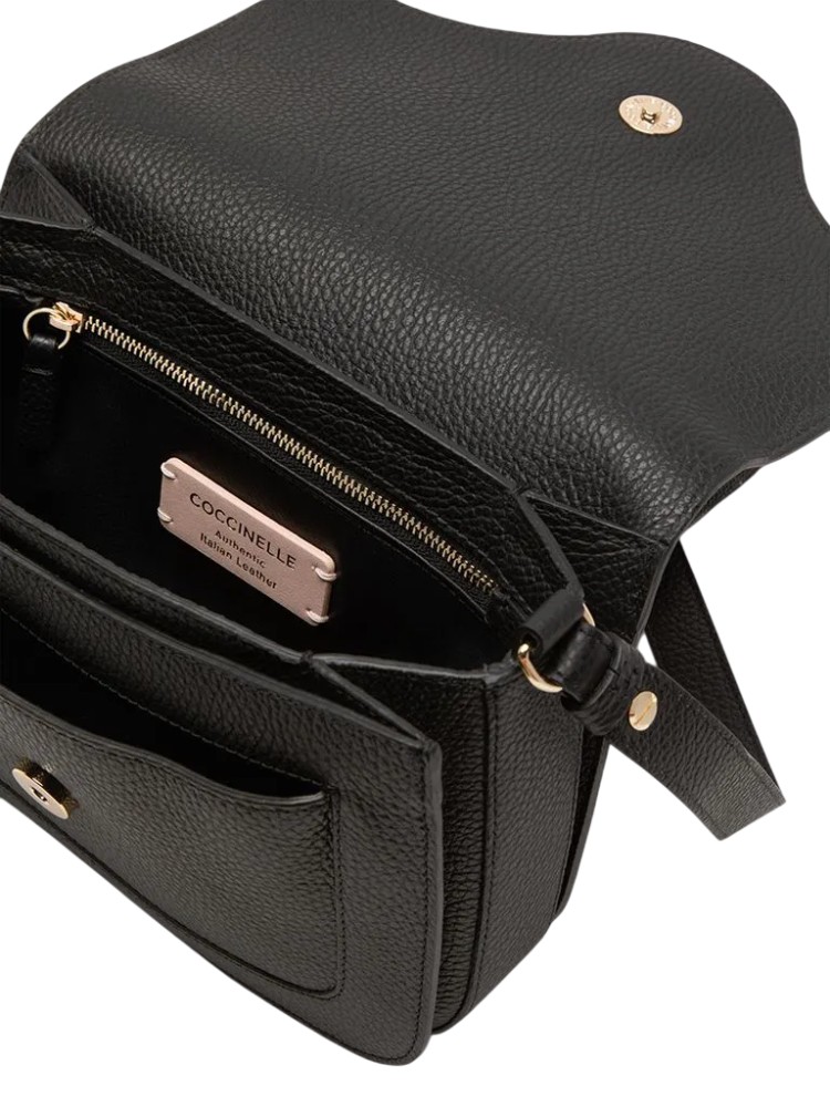 Una nuova signature entra a far parte del brand, Coccinelle C-Me. Il logo reinterpretato attraverso la C di Coccinelle che si annoda e abbraccia il plettro, elemento iconico del brand, un'unione che si intreccia con la vita di una donna tra passato e presente. Le linee geometriche e le curve sofisticate rafforzano il design, mentre la costruzione a soffietti aggiunge un tocco di funzionalità e delicata eleganza a questa borsa che vuole essere la compagna essenziale della donna Coccinelle durante la sua giornata. Questo modello è realizzato in pelle lavorata tramite specifici macchinari e poi bottalata al fine di mantenerne la morbidezza. È una pelle molto resistente che si presta a una facile pulizia, ideale per un uso quotidiano.