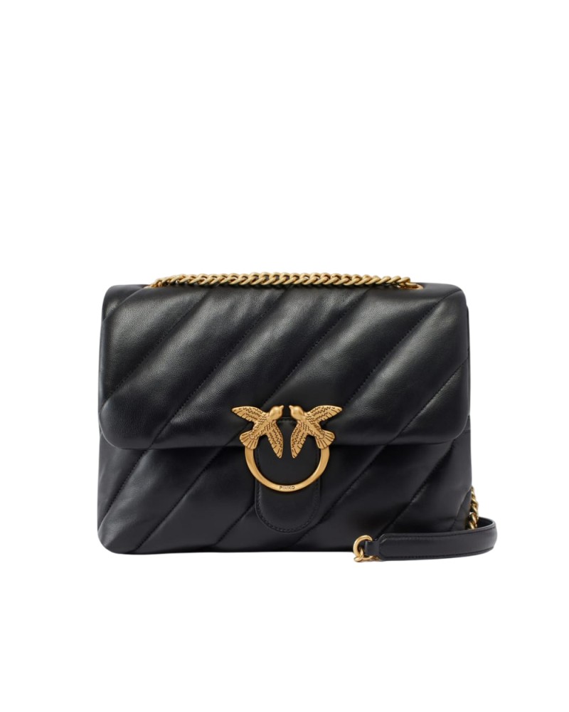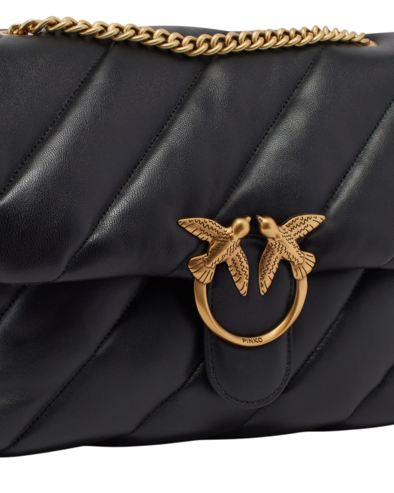Borsa grande a tracolla Big Love Bag Puff in morbida nappa caratterizzata da maxi trapuntatura obliqua. La chiusura è completata dall'iconica fibbia in metallo Love Birds Diamond Cut. L'interno è foderato in microfibra scamosciata e comprende tramezza chiusa con zip e tasca a parete. La tracolla combina la classica catena metallica rotonda al pratico spallaccio in nappa.