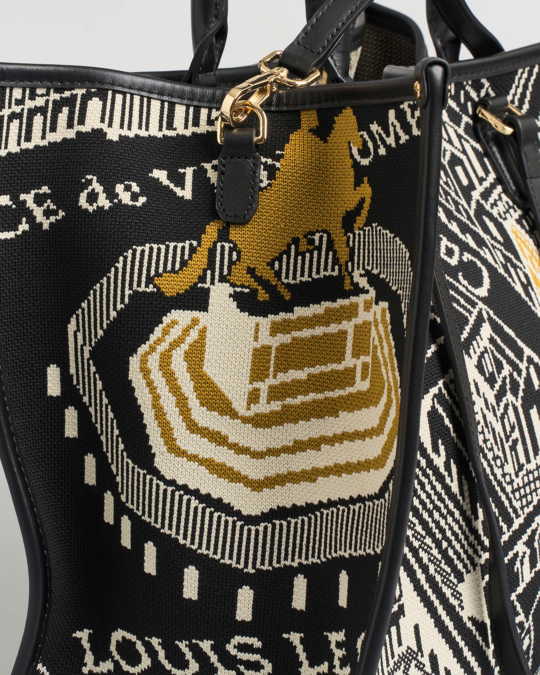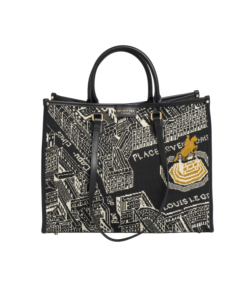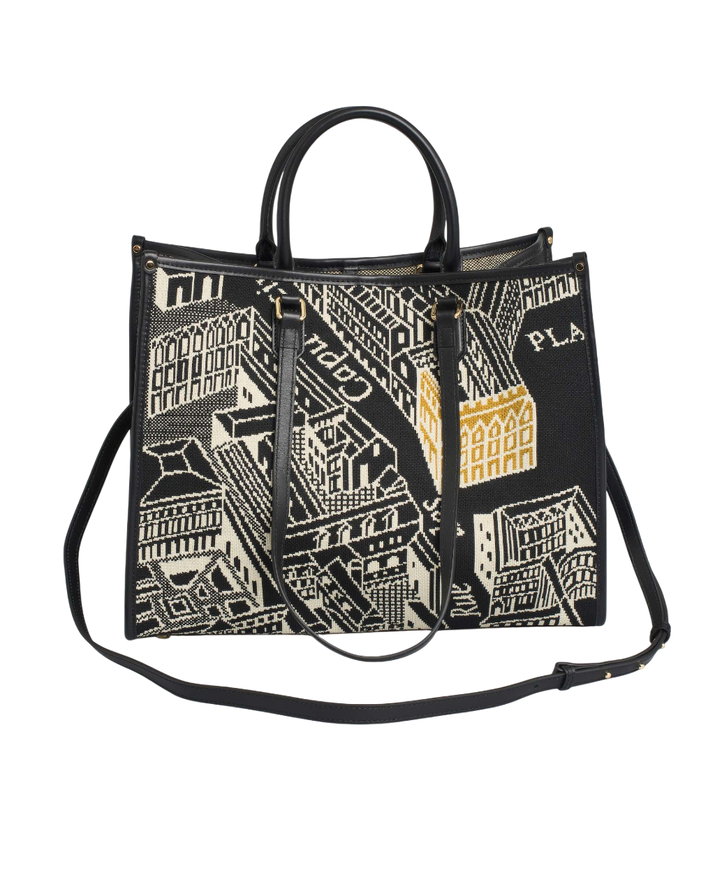 Tote bag misura grande in tessuto con motivo jacquard a contrasto di colore. Base rigida con piedini di protezione in metallo. Profili, manici a mano e a spalla inamovibili in pelle. Etichetta logo in pelle con logo stampato applicata sul davanti, chiusura a listino con moschettone in metallo. Pochette interna rimovibile con chiusura a cerniera e patch logo in pelle applicata. Tracolla rimovibile con moschettoni e regolabile con cinturino.