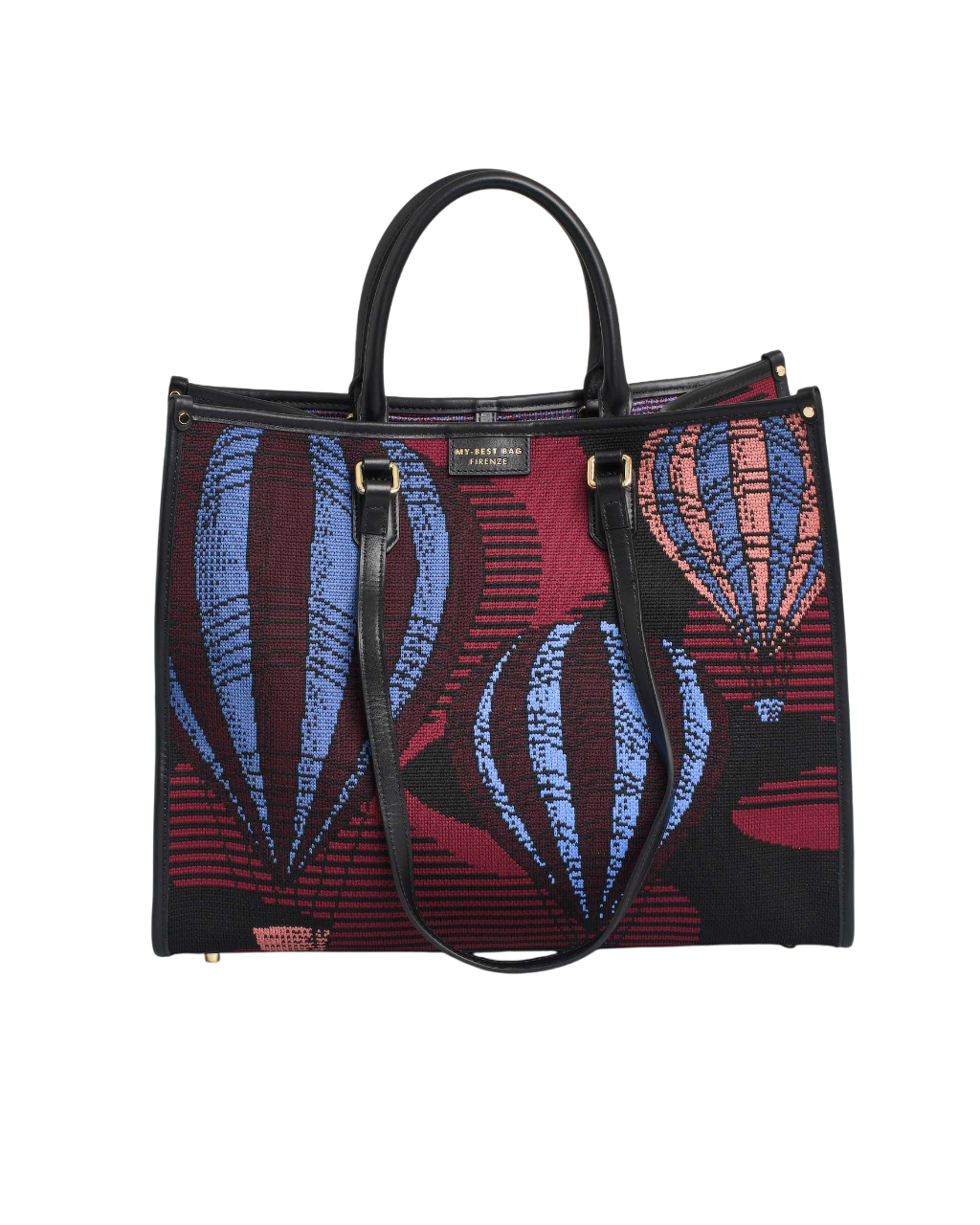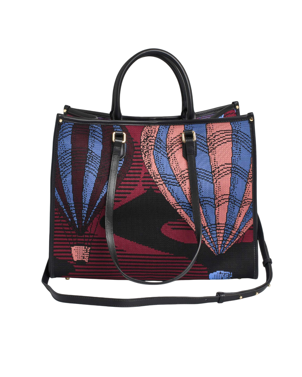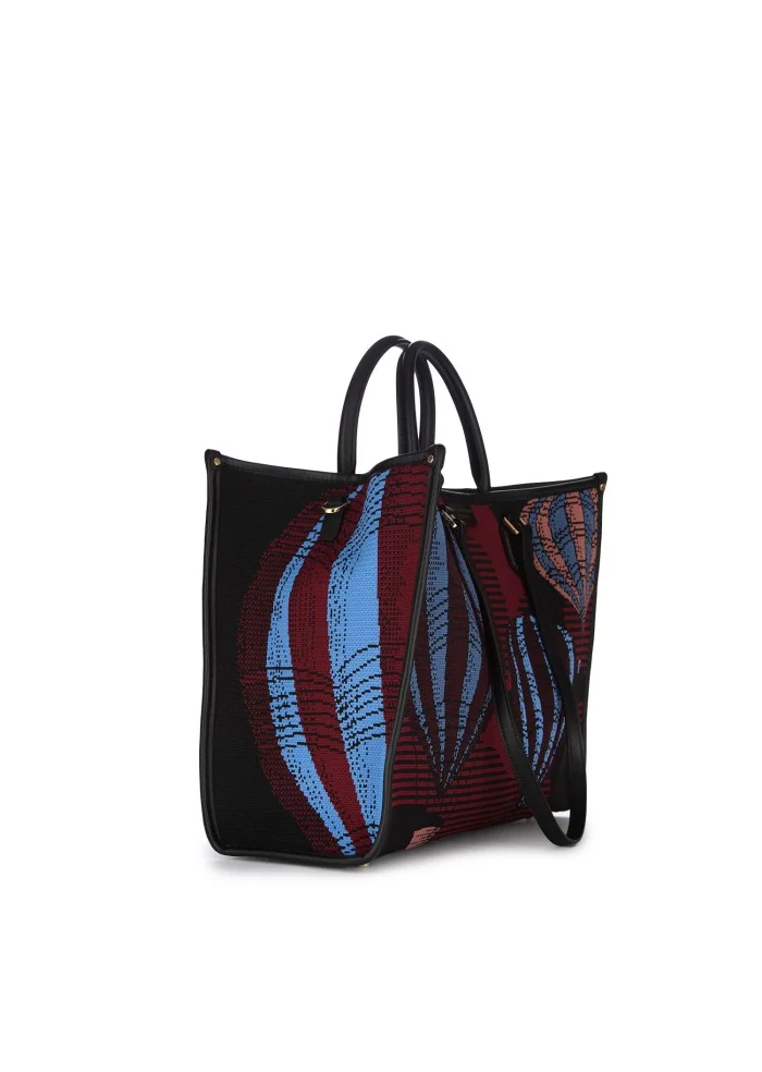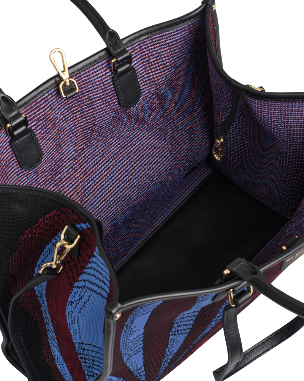 Tote bag misura grande in tessuto con motivo jacquard a contrasto di colore. Base rigida con piedini di protezione in metallo. Profili, manici a mano e a spalla inamovibili in pelle. Etichetta logo in pelle con logo stampato applicata sul davanti, chiusura a listino con moschettone in metallo. Pochette interna rimovibile con chiusura a cerniera e patch logo in pelle applicata. Tracolla rimovibile con moschettoni e regolabile con cinturino.