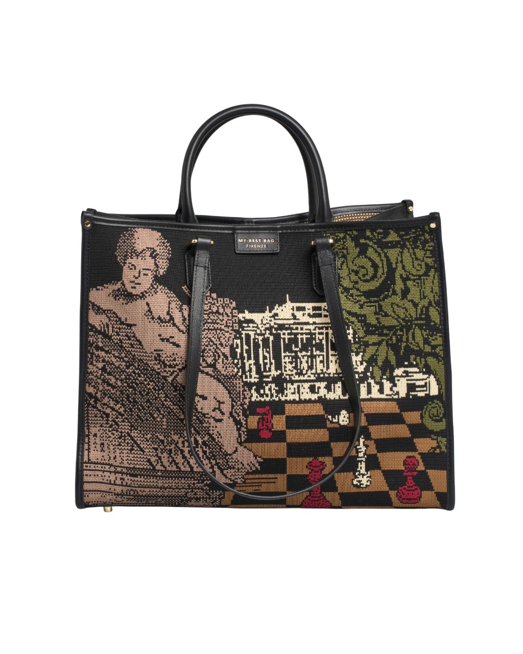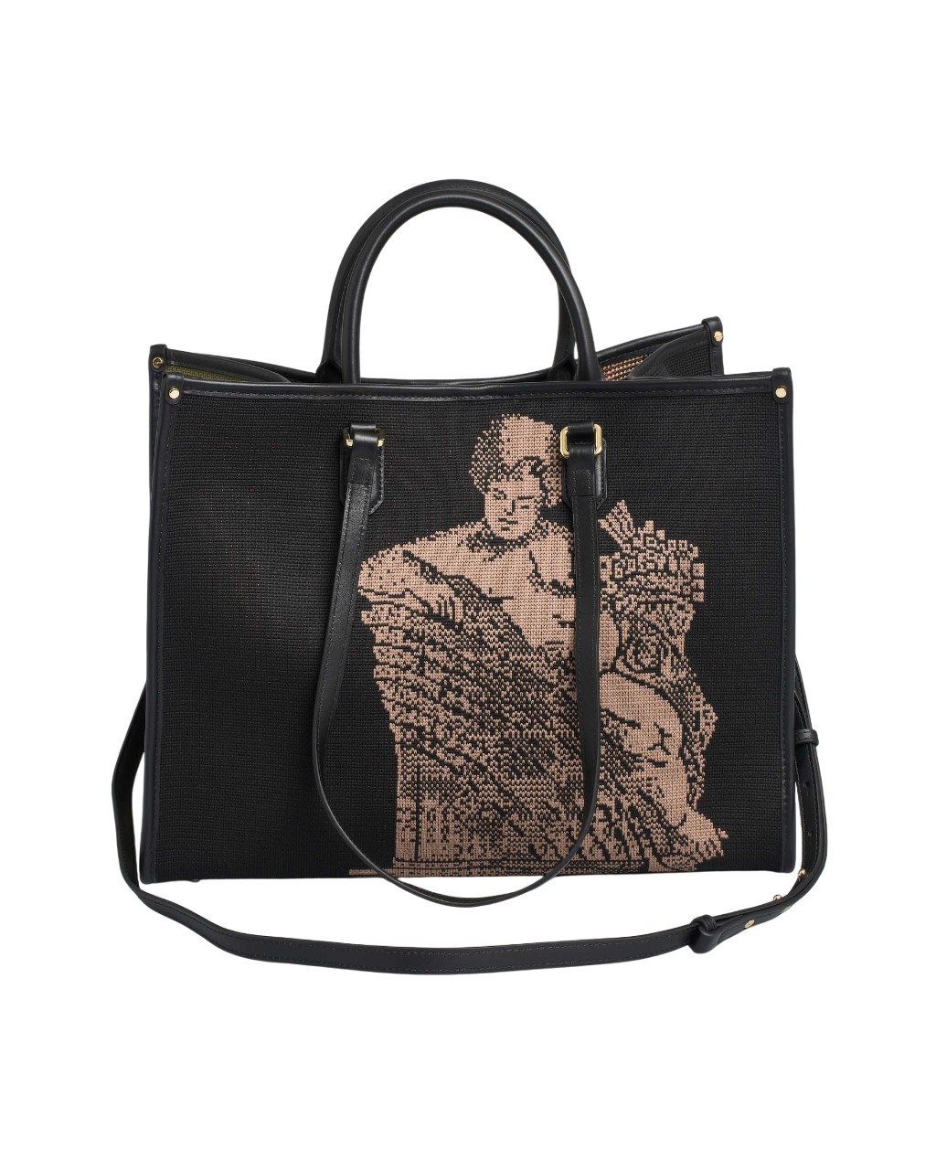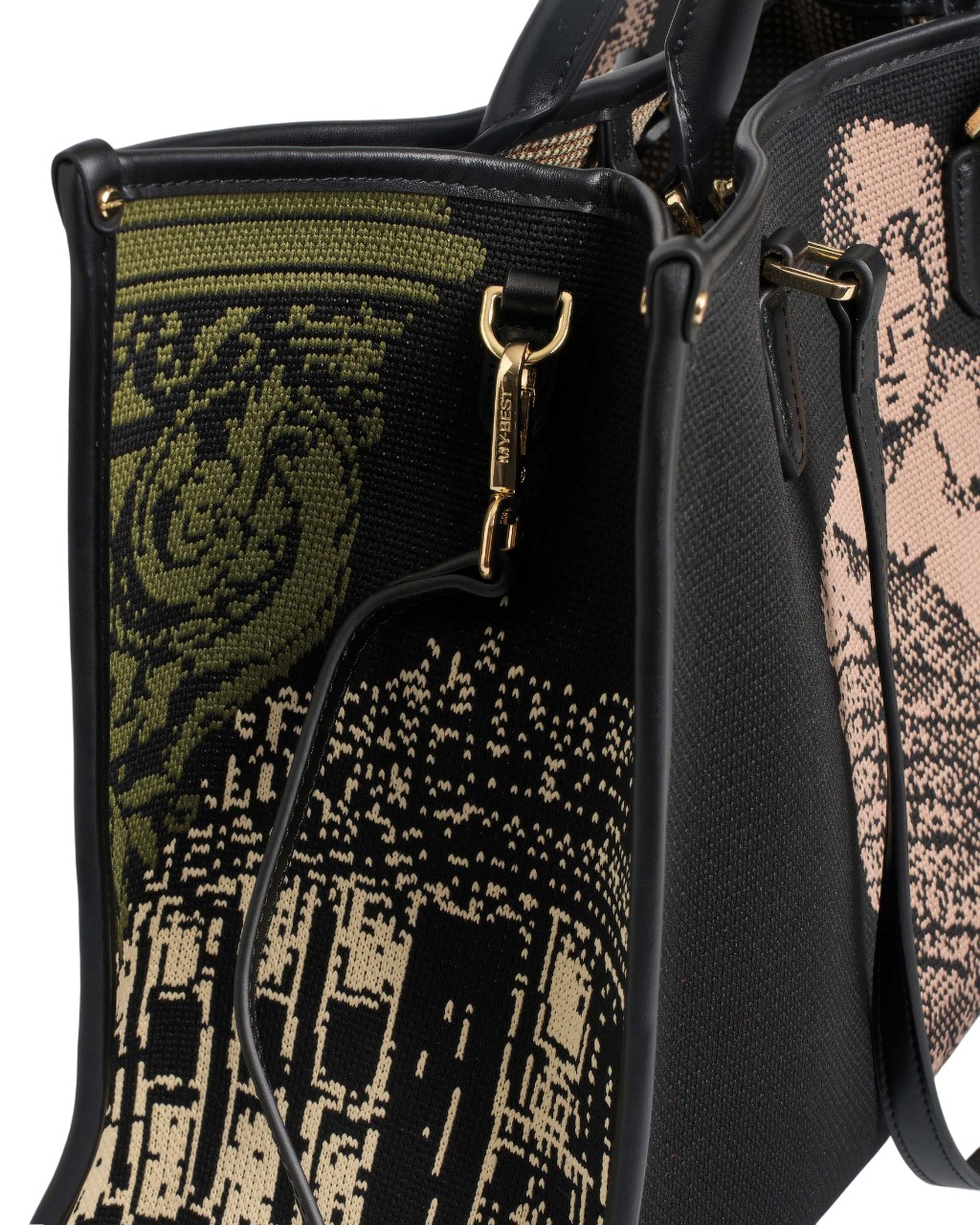 Tote bag misura grande in tessuto con motivo jacquard a contrasto di colore. Base rigida con piedini di protezione in metallo. Profili, manici a mano e a spalla inamovibili in pelle. Etichetta logo in pelle con logo stampato applicata sul davanti, chiusura a listino con moschettone in metallo. Pochette interna rimovibile con chiusura a cerniera e patch logo in pelle applicata. Tracolla rimovibile con moschettoni e regolabile con cinturino.