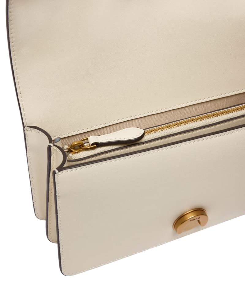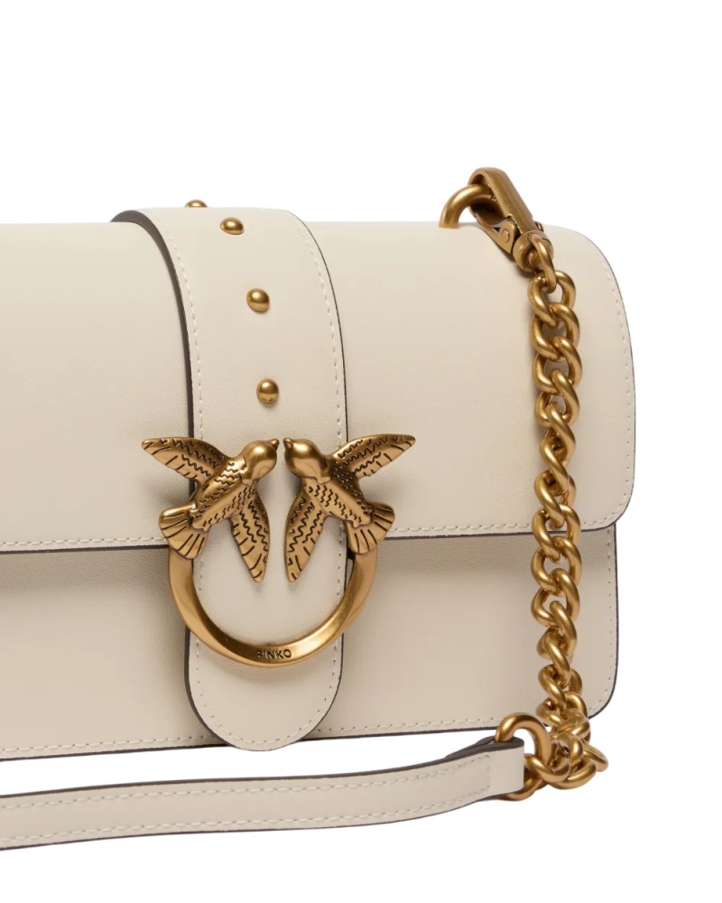 Borsa a tracolla piccola Love Bag One realizzata in pelle dalla mano seta. Caratterizzato dalla tracolla regolabile e rimovibile in pelle e catena, il modello risulta estremamente versatile e pratico. La chiusura a baccello con bottone magnetico è completata da fibbia con logo uccellini Love Birds Diamond Cut e piccole borchie in metallo in galvanica antique gold. L'interno è foderato in cotone e presenta una tasca con zip per tenere al sicuro i tuoi essenziali. Attiva la tua borsa PINKO: verifica l'autenticità del tuo prodotto e accedi all'esperienza personalizzata avvicinando il tuo smartphone al ricamo Love Birds che trovi sul retro della borsa!