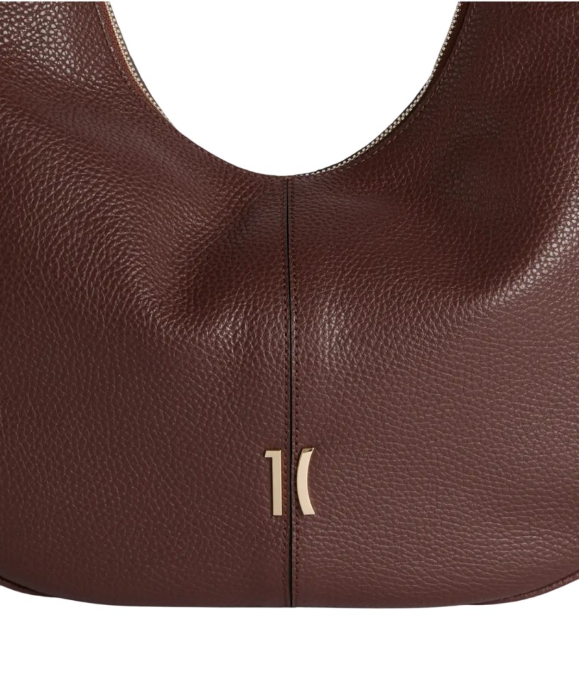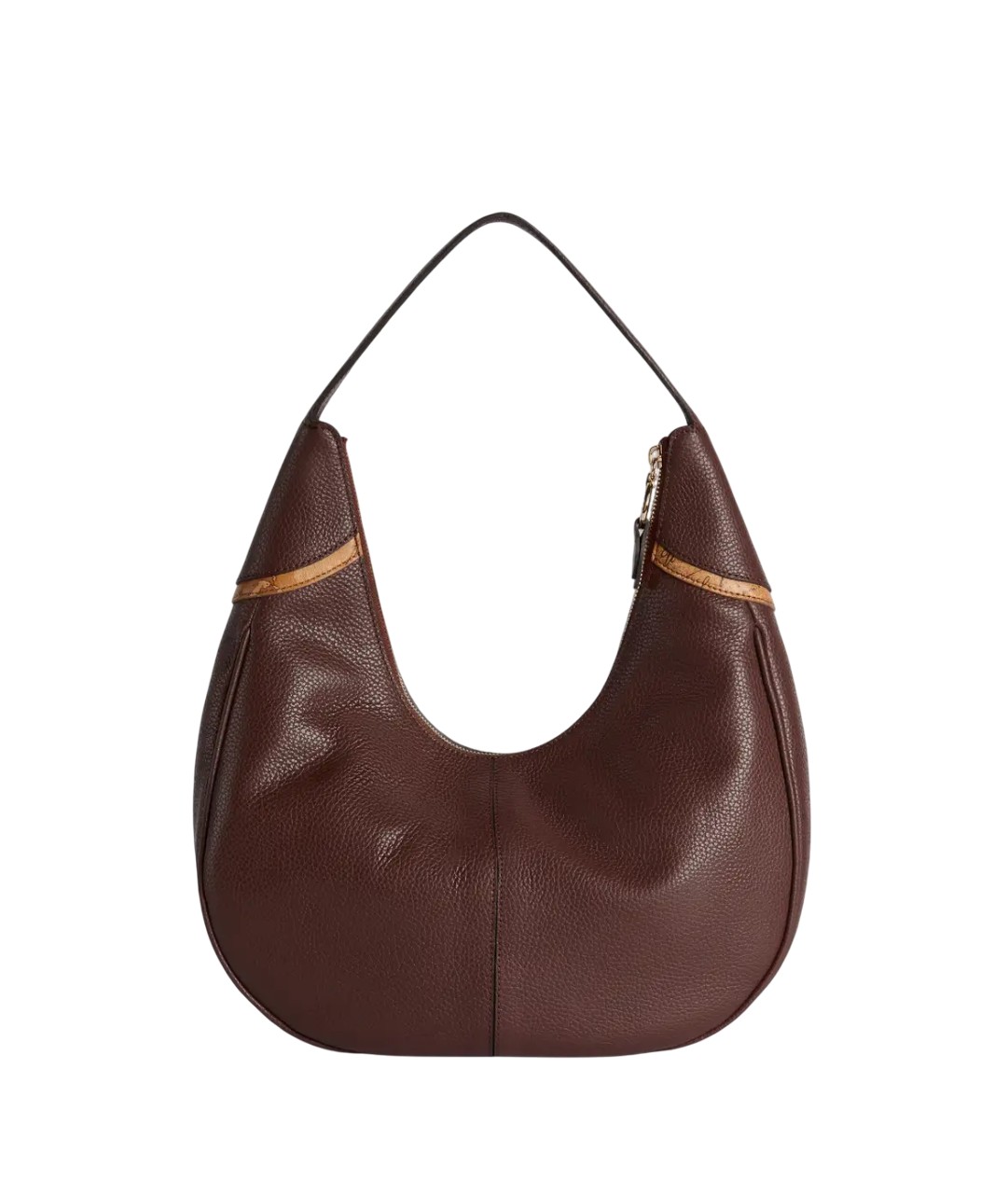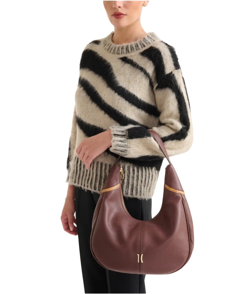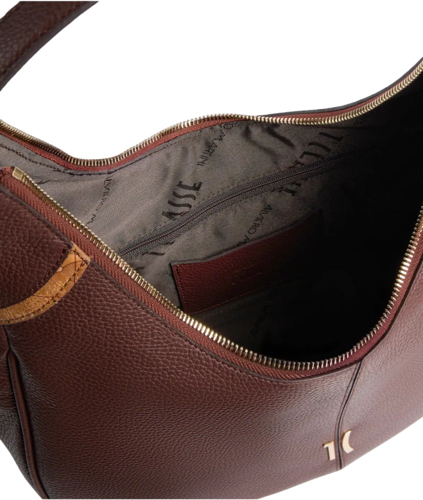 La silhouette stondata della borsa sottospalla Castle Leather dialoga con gli inserti a lancia in nappa stampa Geo Classic, ispirati alle arcate neogotiche dell'architettura scozzese. La testa scavata facilità la portabilità e crea un volume capiente, completo di svariate tasche interne. Il taglio centrale cucito sui lati attraversa il logo 1C in oro chiaro ed esalta la morbida pelle granata, che rende il color Mogano ricco e luminoso. L'effetto finale è armonioso e sofisticato, da esaltare con cappotti sciancrati per look femminili e di tendenza.