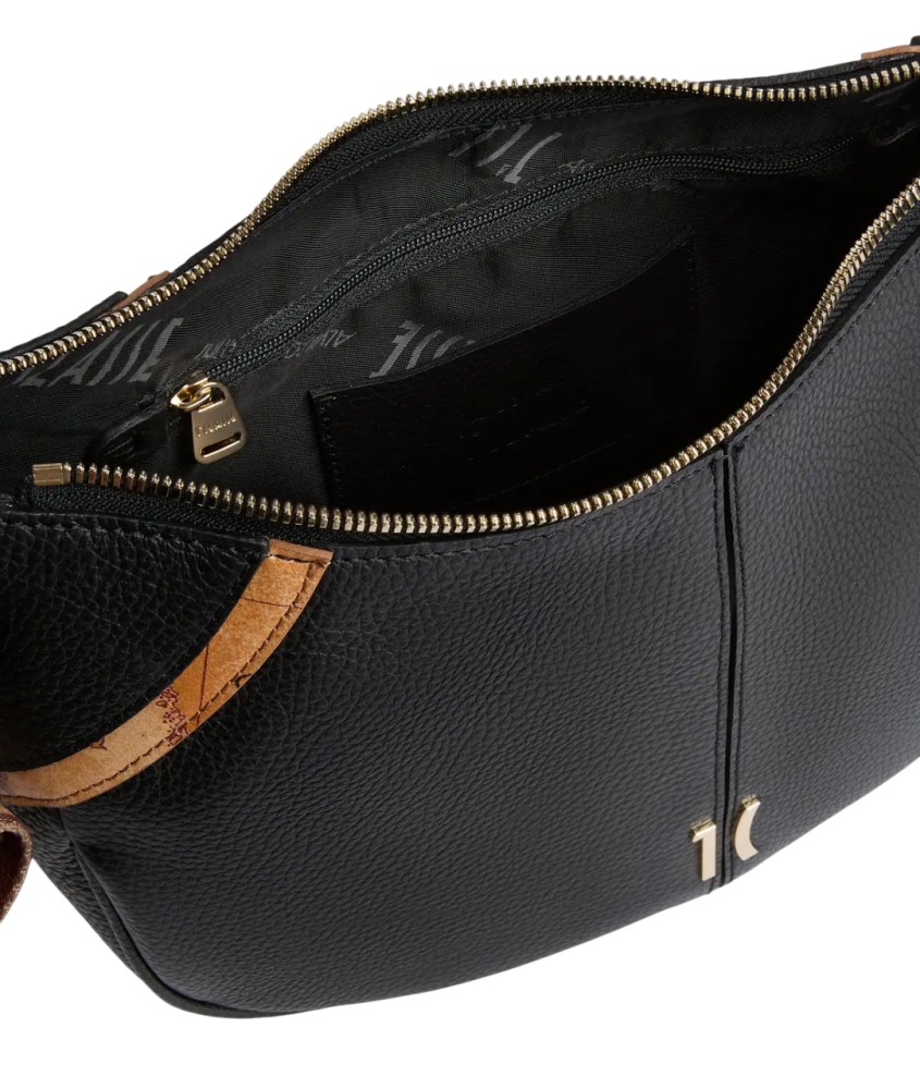 Un'attitude rilassata e al contempo ricca caratterizza la tracolla a mezzaluna Castle Leather, realizzata in morbida pelle granata che valorizza l'intenso color Mogano. Il volume stondato si armonizza con gli inserti in nappa stampa Geo Classic, ispirati alle guglie dei castelli neogotici scozzesi, ed è percorso verticalmente da un taglio cucito che esalta il materiale. L'iconica mappa è presente anche sulla tracolla regolabile e rimovibile in nastro, completato sul lato opposto dal logo 1ᴬ Classe in corsivo. Illuminata dal logo 1C in oro chiaro, saprà elevare i look urban con un tocco sporty-chic.