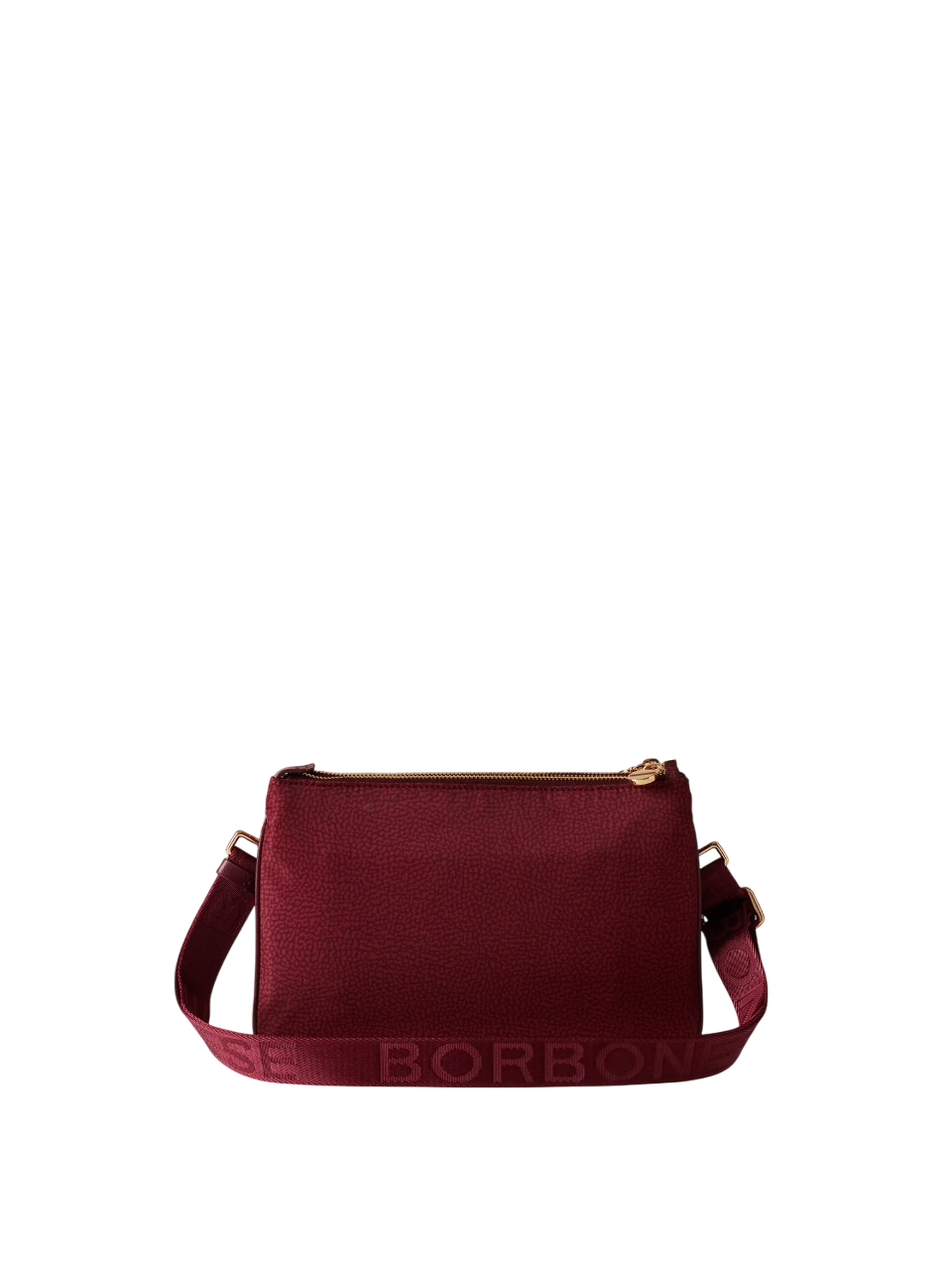 La borsa a tracolla è in grado di ospitare tutto quel che serve, abbinandosi facilmente a diversi outfit. La versione che propone Borbonese è realizzata in nylon OP riciclato con dettagli di pelle. La chiusura dei due scomparti è regolata da zip con tiralampo a vite, simbolo del brand. La tracolla, in nastro di nylon logato, è modulabile grazie a una fibbia autobloccante ed è staccabile tramite moschettoni. L'interno, foderato in tessuto jacquard, ha tasche e scomparti. Le metallerie sono in galvanica oro chiaro.