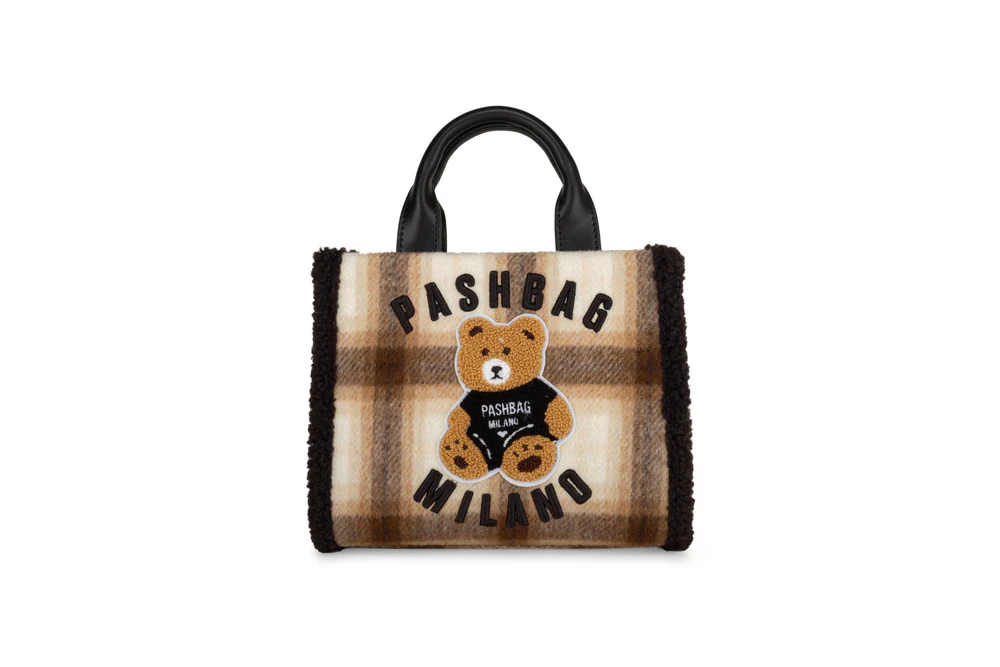 Borsa a mano con tracolla rimovibile in lana cotta ed eco pelliccia, dettaglio centrale orsetto con logo ricamato.