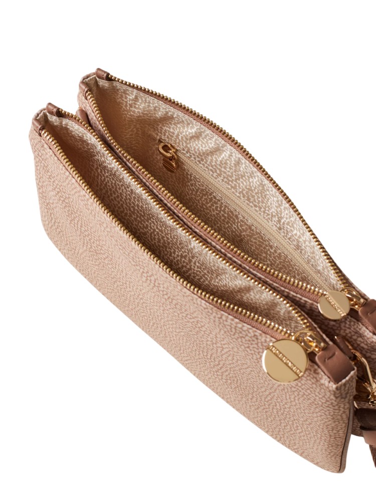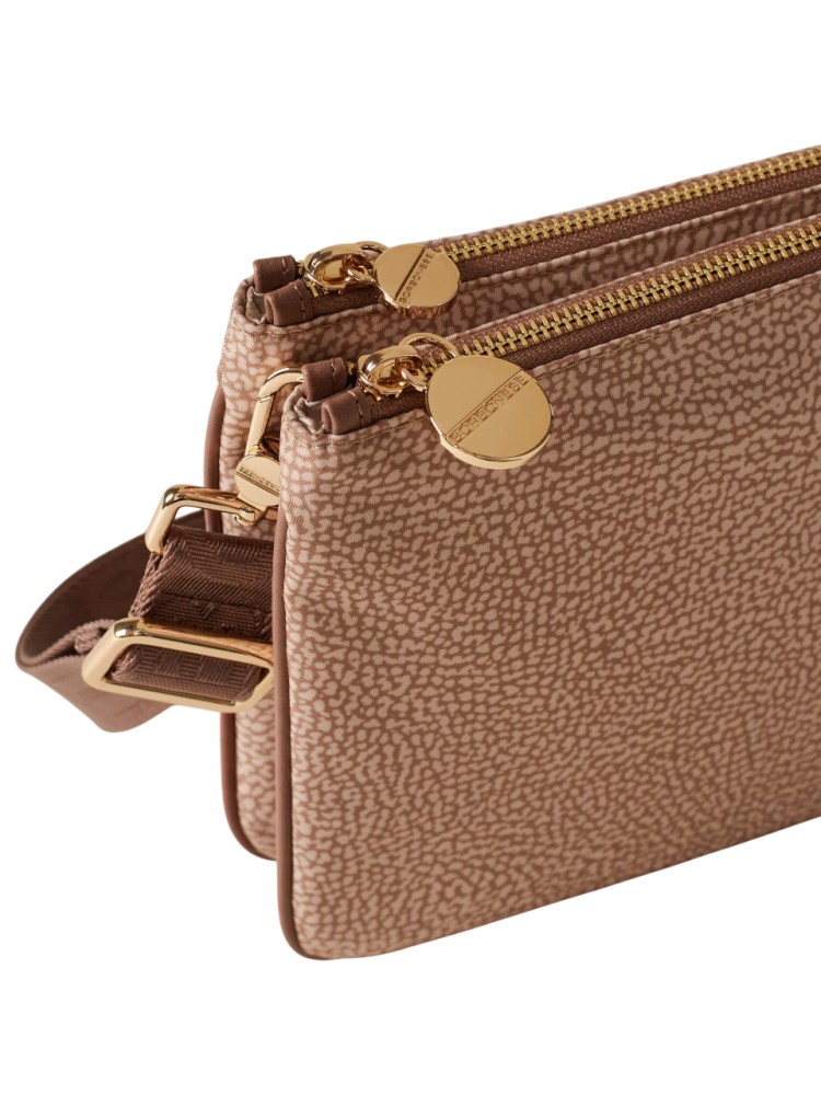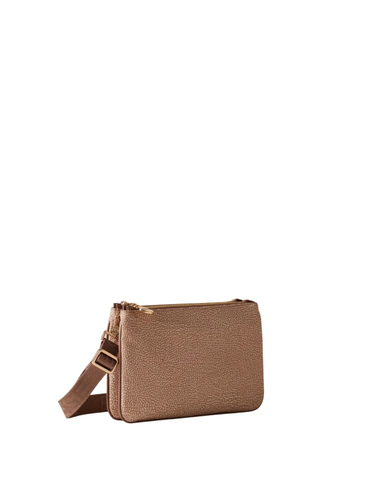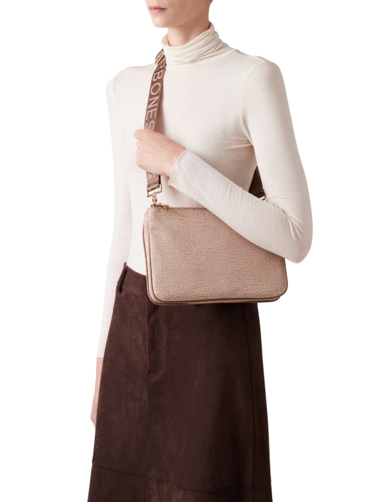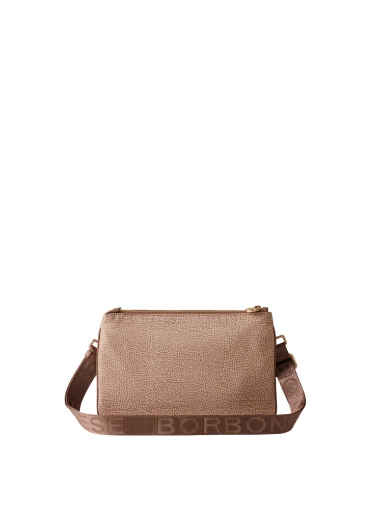 La borsa a tracolla è in grado di ospitare tutto quel che serve, abbinandosi facilmente a diversi outfit. La versione che propone Borbonese è realizzata in nylon OP riciclato con dettagli di pelle. La chiusura dei due scomparti è regolata da zip con tiralampo a vite, simbolo del brand. La tracolla, in nastro di nylon logato, è modulabile grazie a una fibbia autobloccante ed è staccabile tramite moschettoni. L'interno, foderato in tessuto jacquard, ha tasche e scomparti. Le metallerie sono in galvanica oro chiaro.