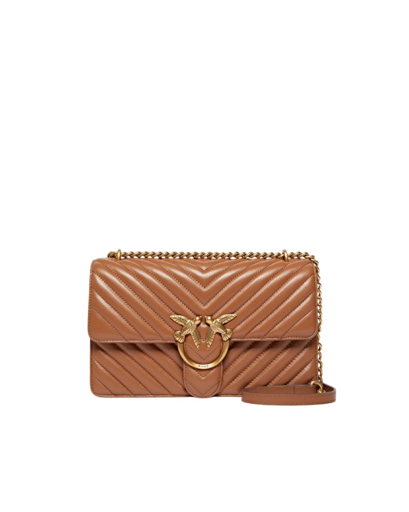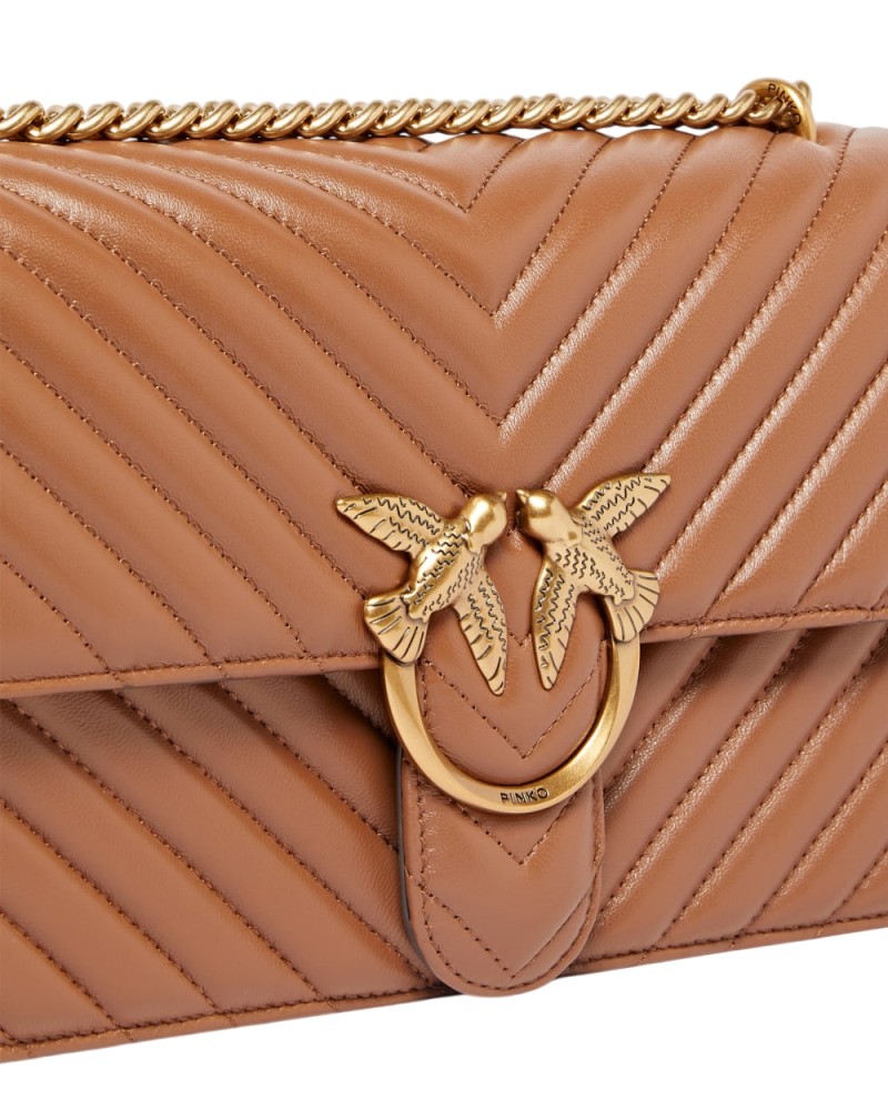 Classic Love Bag One in nappa trapuntata con motivo chevron. La chiusura è completata dall'iconica fibbia Love Birds Diamond Cut in metallo. L'interno è foderato in microfibra scamosciata e comprende tramezza chiusa con zip e tasca a parete in pelle. La tracolla combina la classica catena rotonda al pratico spallaccio in pelle regolabile.