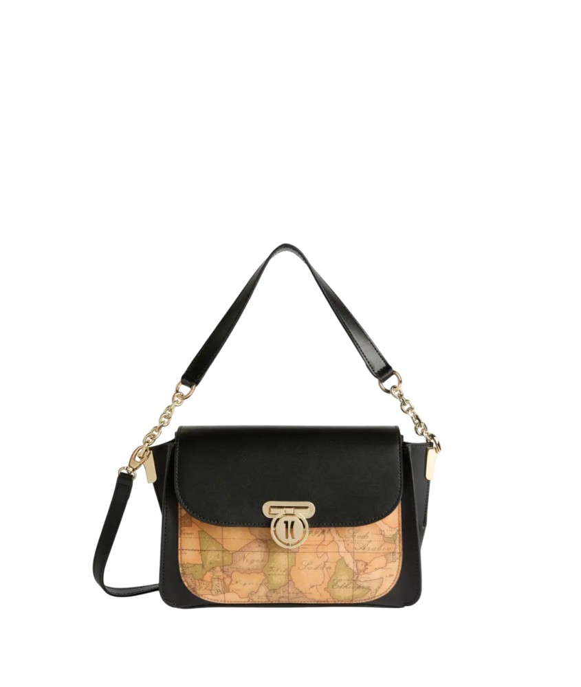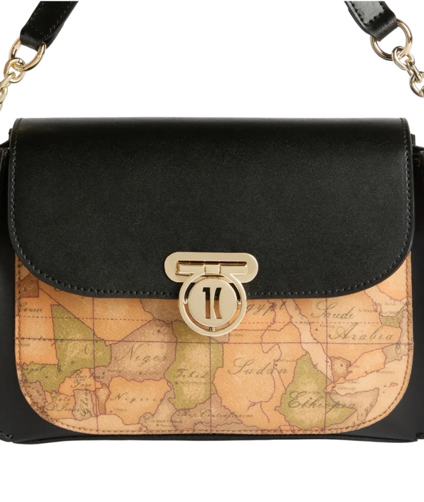 Compatta e strutturata, la borsa a mano con patta Geo Secret Lock è realizzata in pelle liscia abbinata al maxi inserto frontale in tessuto Geo Classic. A dare il nome alla Linea è la chiusura a incastro con medaglietta logata 1C, che si solleva e scivola attraverso la fessura per aprire la patta. Il manico in pelle con inserto in catena permette di portare la borsa a mano o a spalla, mentre la tracolla regolabile e rimovibile consente anche la portabilità crossbody. Abbinala a stivali o tronchetti per look da giorno chic, o alle décolleté per combinazioni eleganti da sera.