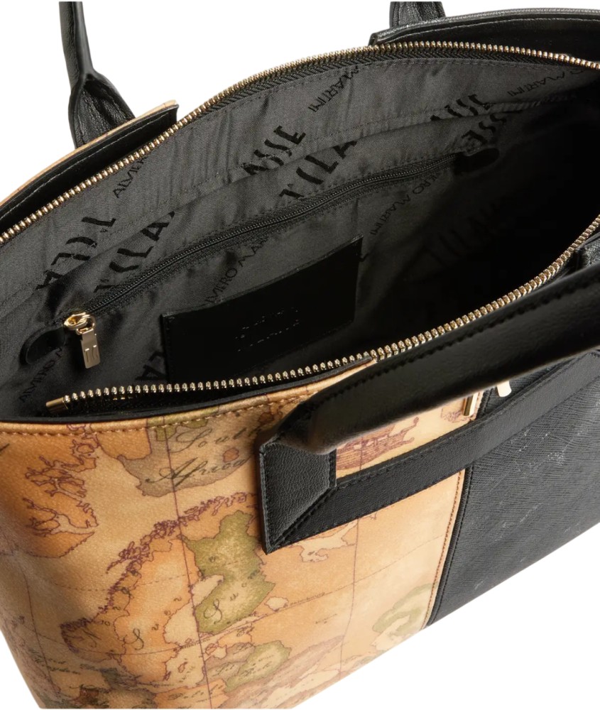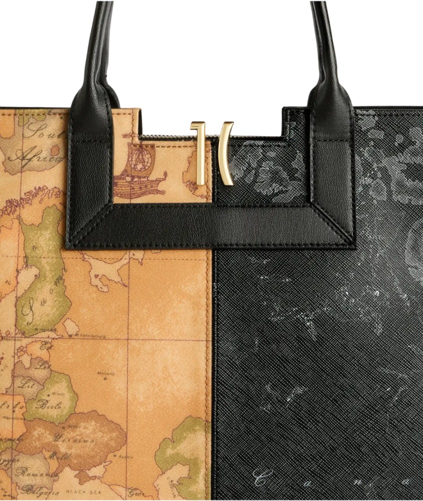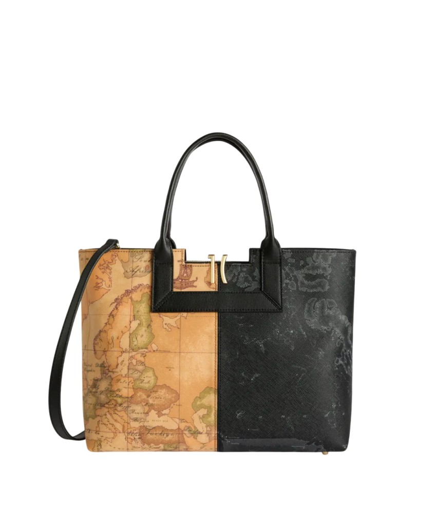 Metà in tessuto Geo Classic e metà in tessuto Geo Night, la borsa a mano Eclipse Geo mostra due volti dell'iconica mappa del brand in un elegante contrasto. Il dettaglio rettangolare in eco pelle nera armonizza il design, riflettendo la sagomatura in testa e incorniciando il logo 1C con finitura oro chiaro. Dotata di manici e tracolla regolabile e rimovibile per una doppia portabilità, è ideale da abbinare sia a cappotti e stivali sia a imbottiti in nylon e sneaker nere per look da giorno magnetici.
