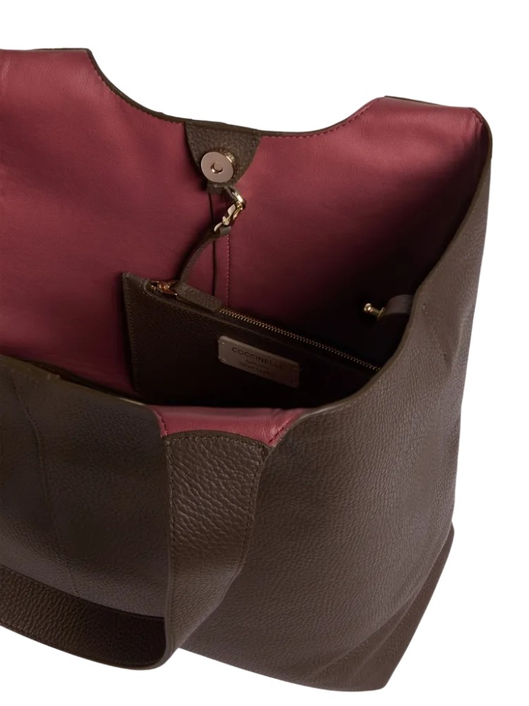 Coccinelle C-Easy è una shopping bag caratterizzata da curve sinuose che esaltano la bellezza del pellame. La funzionalità è espressa dalla capienza e dalla pochette interna ma, il fulcro del design risiede nella chiusura che può avvenire centralmente attraverso un magnete lasciando i lati aperti oppure, ripiegando i fianchi attraverso il laccio con gemello. Non manca un elemento metallico che ritroviamo nel manico con il nuovo logo C-Me, che illumina questa borsa dall’anima estremamente versatile. Questo modello è realizzato in pelle lavorata tramite specifici macchinari e poi bottalata al fine di mantenerne la morbidezza. È una pelle molto resistente che si presta a una facile pulizia, ideale per un uso quotidiano.