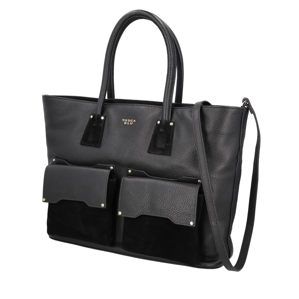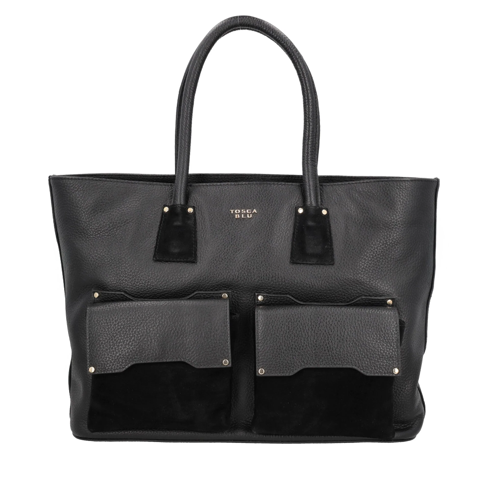 Capiente e versatile, questa borsa shopping di Tosca Blu è confezionata in vera pelle color fango. Il design è caratterizzato da due tasche con pattina applicate sulla parte frontale realizzate in pelle scamosciata. Internamente è presente un unico scomparto chiuso con zip dove si possono trovare una taschina con chiusura lampo e due tasche aperte. Porta questa borsa shopping a mano o a spalla grazie al comodo manico, oppure utilizza la pratica tracolla in dotazione. Completa l’accessorio l’immancabile logo lettering in metallo applicato sul davanti.