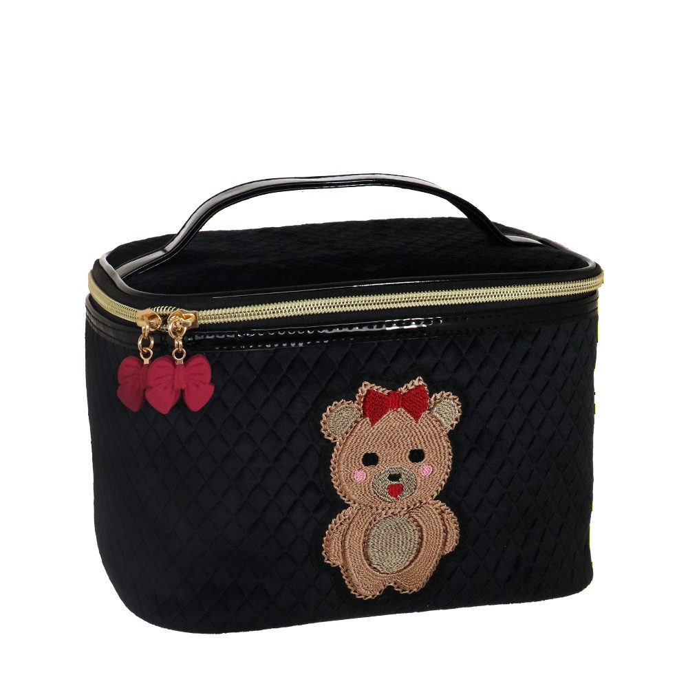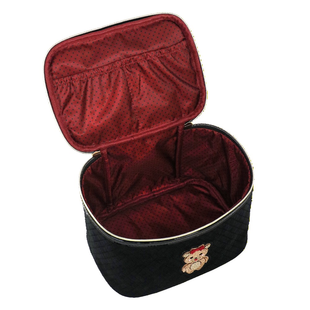 BEAUTY CASE M TEDDY CHIC NERO, molto capiente e comodo per il viaggio, con il suo manico diventa comodo da trasportare. Realizzato in velluto trapuntato in due varianti colore, patch ricamata applicata e tirazip con fiocco in gomma. Una linea ironica e giocosa, pensata per chi ama esprimere il proprio lato più dolce e spensierato. L'adorabile orsetta, chic e irresistibile, è cucita su un morbido velluto trapuntato, rendendo pochette e beauty uniche nel loro genere. Questa collezione è perfetta per chi si identifica nello stile kidult , perché in fondo non abbiamo mai dimenticato la bambina che vive in noi. Le nostre pochette raccontano la tua personalità, con un design che unisce tenerezza ed eleganza. La deliziosa e morbida icona dell’orsacchiotto, ormai una presenza amata sulle passerelle di tutto il mondo, non poteva mancare nella nostra collezione. Con tutta la dolcezza di una teddy bear, queste pochette in velluto nero e rosso sono perfette per aggiungere un tocco di morbida raffinatezza al tuo stile quotidiano, abbracciando l'eleganza senza rinunciare all’ ironia.