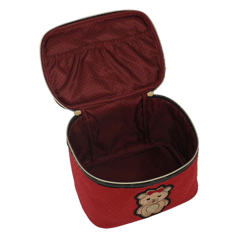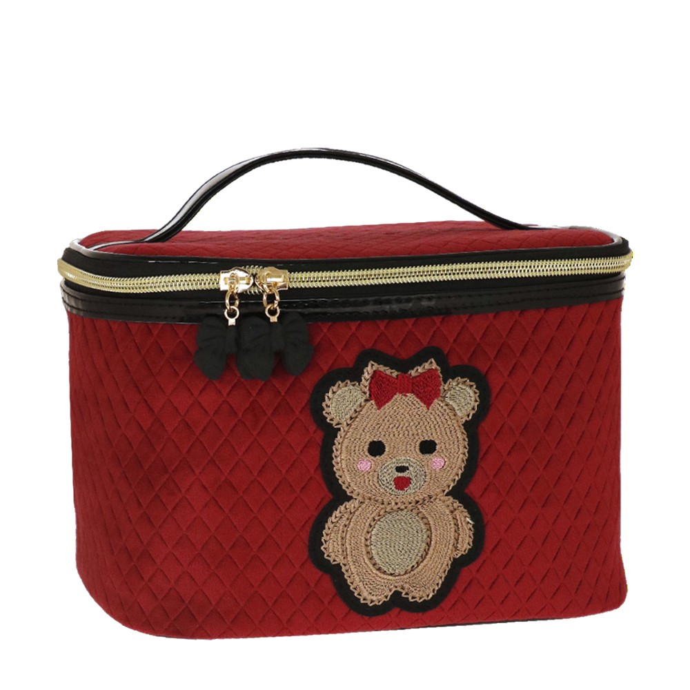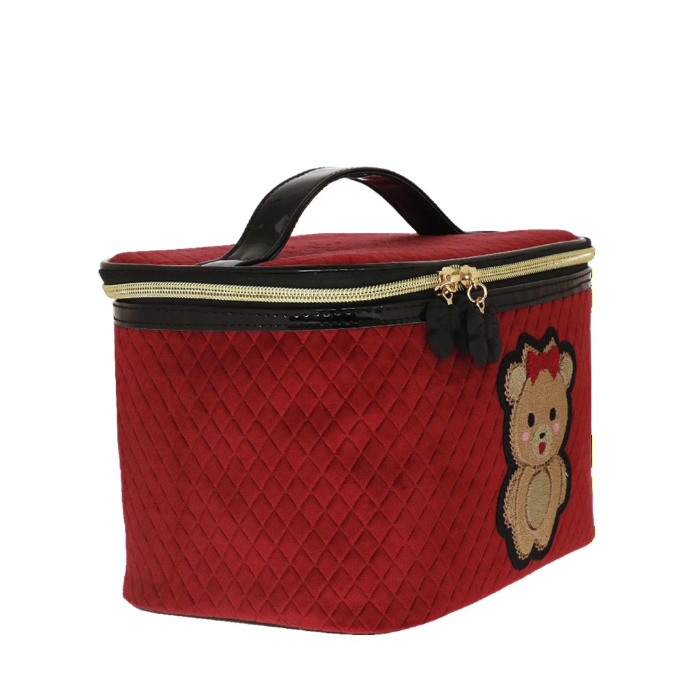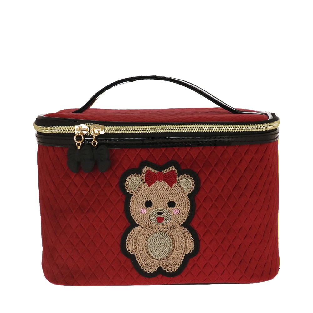 BEAUTY CASE M TEDDY CHIC, molto capiente e comodo per il viaggio, con il suo manico diventa comodo da trasportare. Realizzato in velluto trapuntato in due varianti colore, patch ricamata applicata e tirazip con fiocco in gomma. Una linea ironica e giocosa, pensata per chi ama esprimere il proprio lato più dolce e spensierato. L'adorabile orsetta, chic e irresistibile, è cucita su un morbido velluto trapuntato, rendendo pochette e beauty uniche nel loro genere. Questa collezione è perfetta per chi si identifica nello stile kidult , perché in fondo non abbiamo mai dimenticato la bambina che vive in noi. Le nostre pochette raccontano la tua personalità, con un design che unisce tenerezza ed eleganza. La deliziosa e morbida icona dell’orsacchiotto, ormai una presenza amata sulle passerelle di tutto il mondo, non poteva mancare nella nostra collezione. Con tutta la dolcezza di una teddy bear, queste pochette in velluto nero e rosso sono perfette per aggiungere un tocco di morbida raffinatezza al tuo stile quotidiano, abbracciando l'eleganza senza rinunciare all’ ironia.