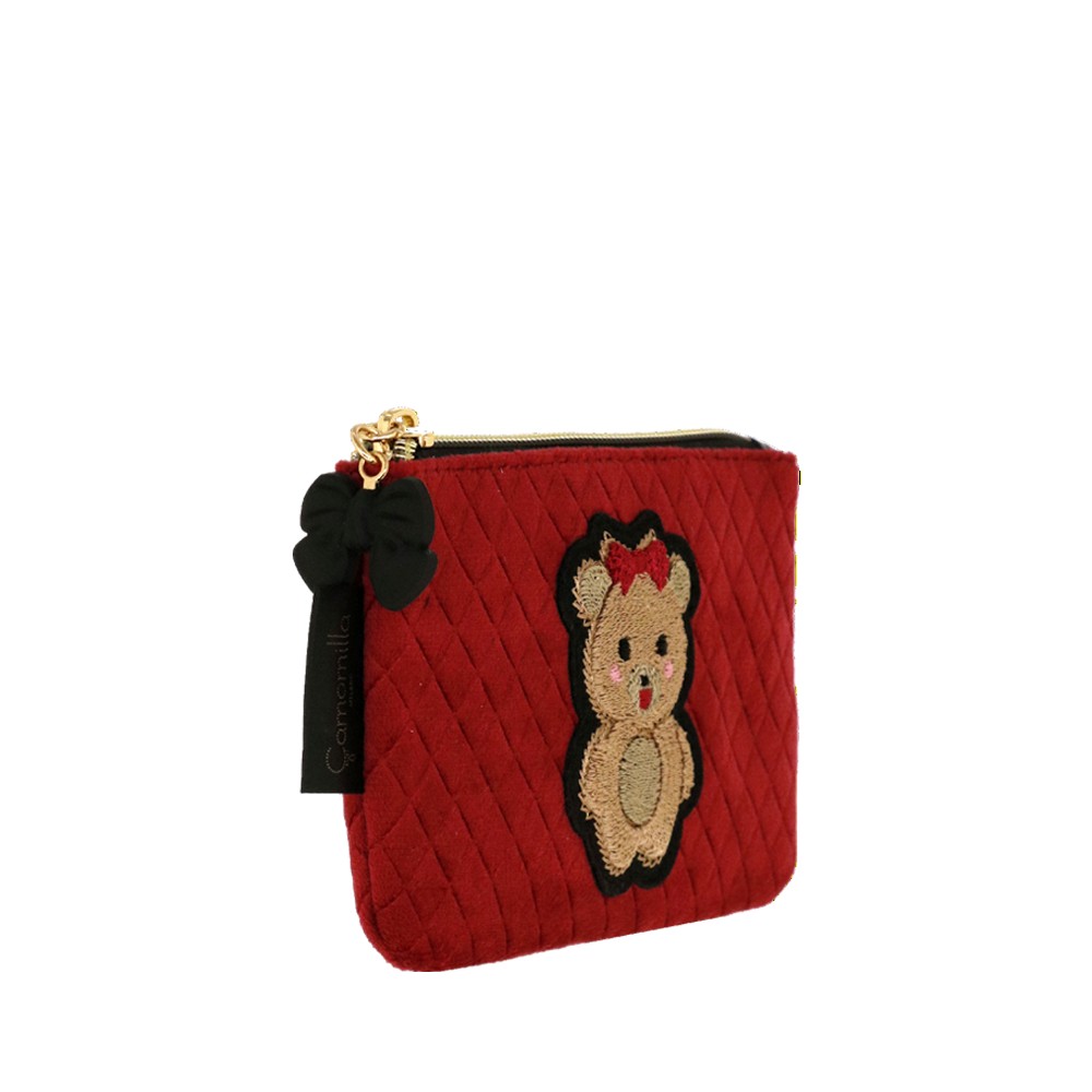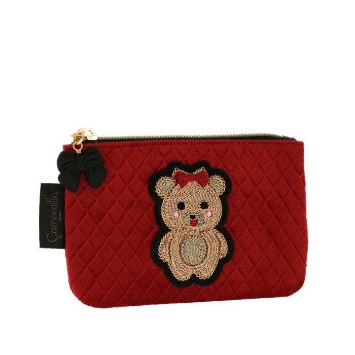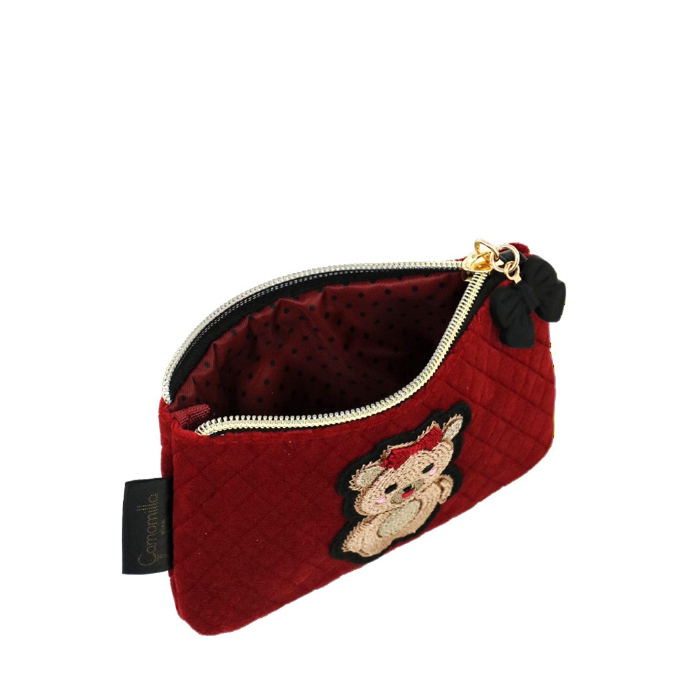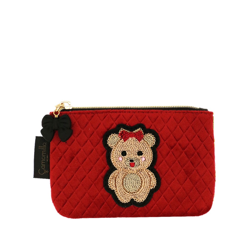 BUSTA PIATTA S TEDDY CHIC , in formato piccolo, comodo da tenere in borsetta, porta rossetto e accessori hi tech utili durante la giornata. Realizzato in velluto trapuntato in due varianti colore, patch ricamata applicata e tirazip con fiocco in gomma. Una linea ironica e giocosa, pensata per chi ama esprimere il proprio lato più dolce e spensierato. L'adorabile orsetta, chic e irresistibile, è cucita su un morbido velluto trapuntato, rendendo pochette e beauty uniche nel loro genere. Questa collezione è perfetta per chi si identifica nello stile kidult , perché in fondo non abbiamo mai dimenticato la bambina che vive in noi. Le nostre pochette raccontano la tua personalità, con un design che unisce tenerezza ed eleganza. La deliziosa e morbida icona dell’orsacchiotto, ormai una presenza amata sulle passerelle di tutto il mondo, non poteva mancare nella nostra collezione. Con tutta la dolcezza di una teddy bear, queste pochette in velluto nero e rosso sono perfette per aggiungere un tocco di morbida raffinatezza al tuo stile quotidiano, abbracciando l'eleganza senza rinunciare all’ ironia.