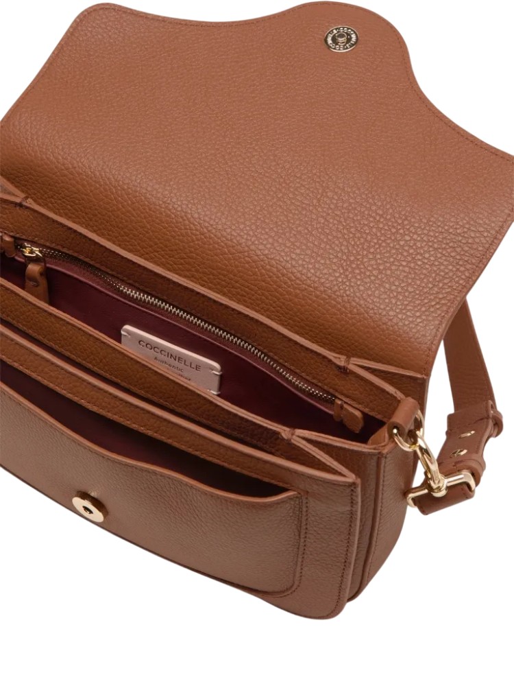 Una nuova signature entra a far parte del brand, Coccinelle C-Me. Il logo reinterpretato attraverso la C di Coccinelle che si annoda e abbraccia il plettro, elemento iconico del brand, un'unione che si intreccia con la vita di una donna tra passato e presente. Le linee geometriche e le curve sofisticate rafforzano il design, mentre la costruzione a soffietti aggiunge un tocco di funzionalità e delicata eleganza a questa borsa che vuole essere la compagna essenziale della donna Coccinelle durante la sua giornata. Questo modello è realizzato in pelle lavorata tramite specifici macchinari e poi bottalata al fine di mantenerne la morbidezza. È una pelle molto resistente che si presta a una facile pulizia, ideale per un uso quotidiano.