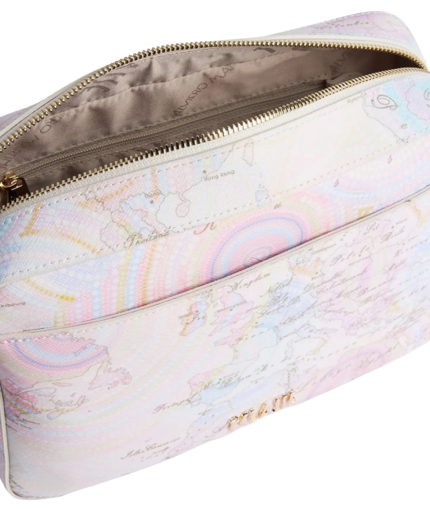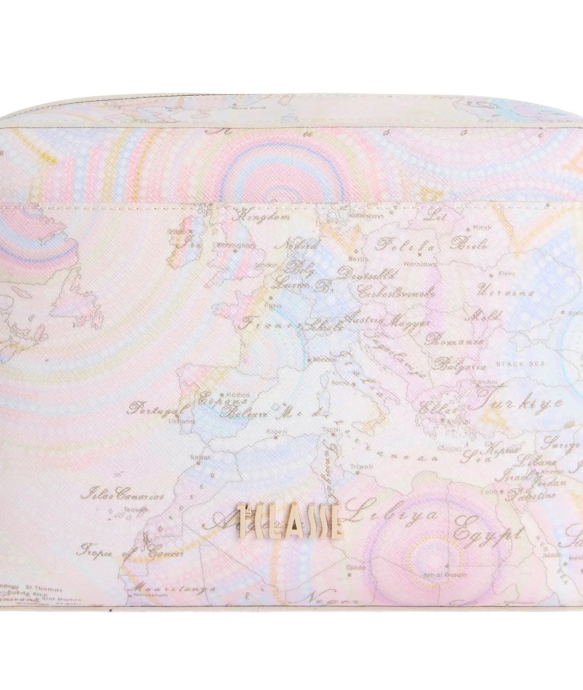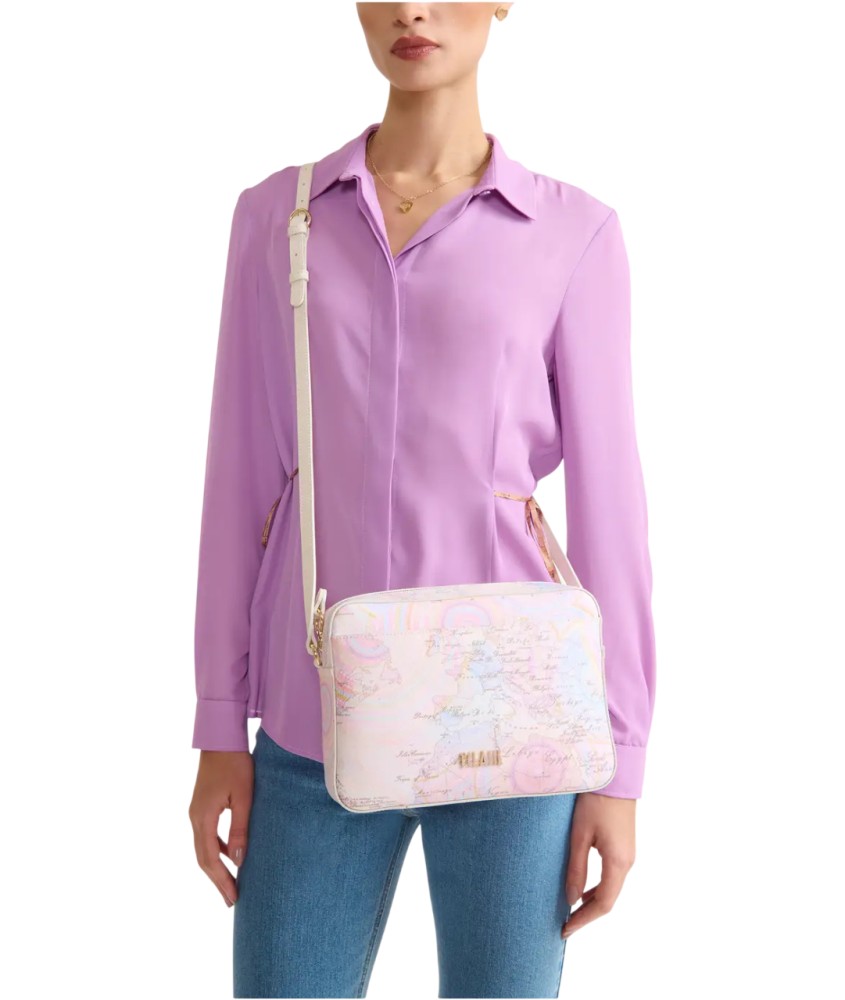 La tracolla reporter Geo Dots Art in tessuto goffrato omaggia la dot art degli aborigeni, che creano scenari composti da cerchi e spirali di puntini accostati tra loro: qui è interpretata in versione Geo e declinata in tonalità pastello ispirate alla stagione. Il volume è squadrato e capiente, provvisto di due tasche interne, più una tasca frontale chiusa con magnete e illuminata dal maxi logo 1ᴬ Classe. Indossala con camicie ampie e abiti casual per un look urban leggero e femminile che ha tutto il carattere della Collezione.