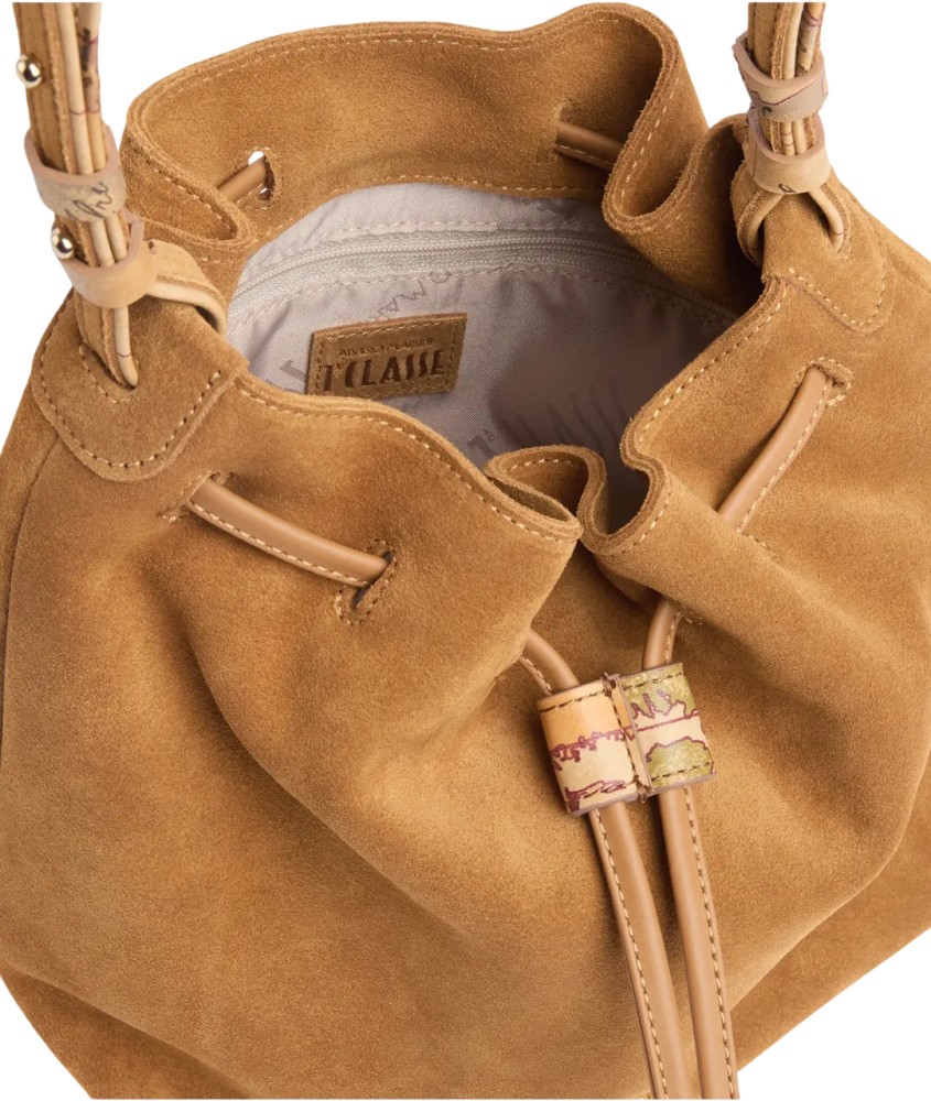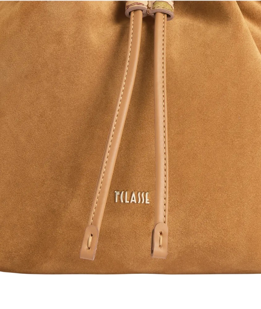 La pelle scamosciata della Linea Tribal Leather dà forma a una borsa secchiello destrutturata, dove la coulisse con fermacorda in tessuto effetto nappa stampa Geo Classic crea morbidi giochi di volumetrie. L'iconica mappa è visibile anche sull'interno della tracolla, regolabile tramite i gemelli sul lato. La texture soffice e talcata rende ancora più delicate le tonalità distintive della Linea, ispirate al mito aborigeno dell'Era del Sogno. Illuminata dal logo 1ᴬ Classe, è perfetta per completare i look primaverili con leggerezza e un tocco pregiato, abbinandosi sia alle combinazioni più casual sia quelle più ricercate.