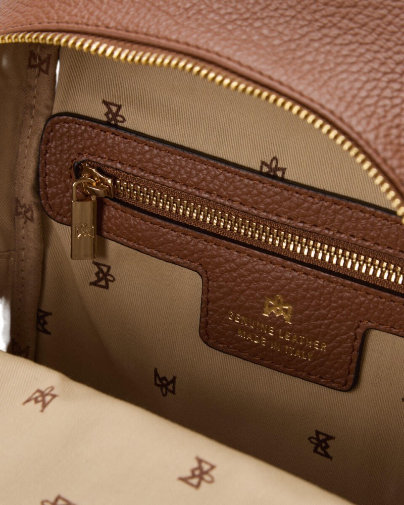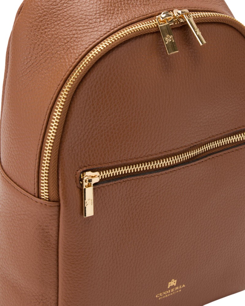 - Dettagli esterni: tasca frontale con chiusura a zip e logo stampato a fuoco colore oro.