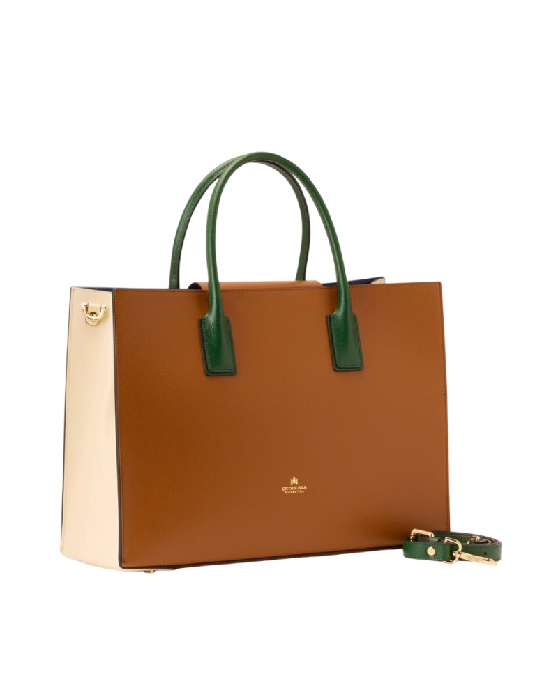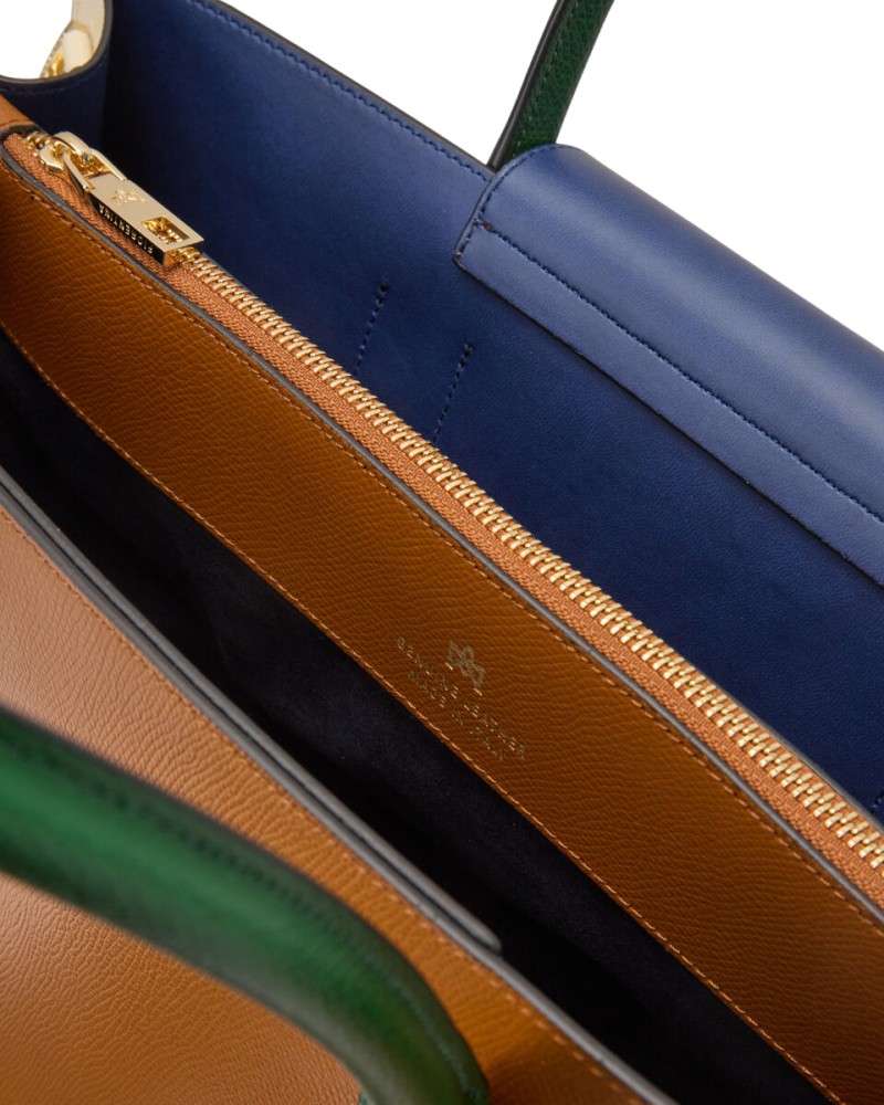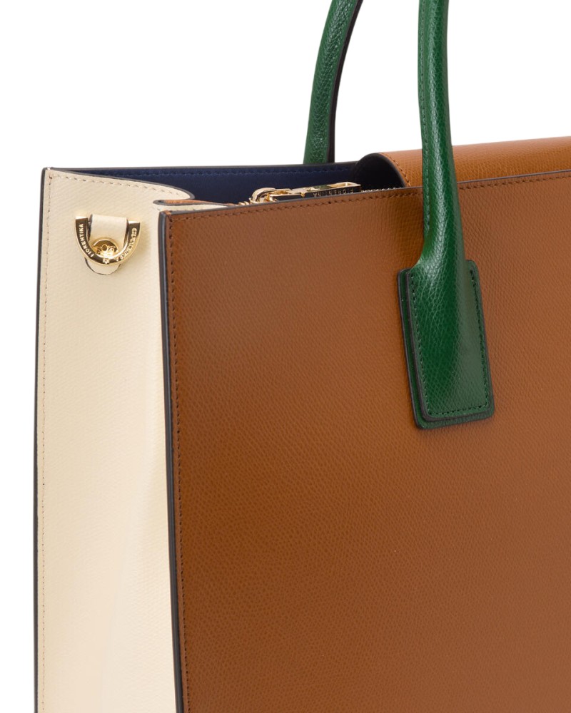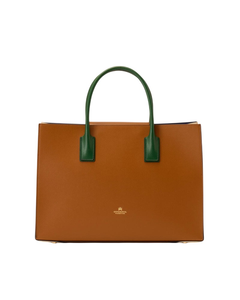 Elegante e sobria, questa grande Tote Alice in vitello palmellato presenta un design solido, sofisticato e compatto con chiusura a doppio bottone e calamita. La rigida silhouette rettangolare è impreziosita dal logo dorato, piedini in metallo e profilo impunturato. L'interno, sfoderato, offre due ampi spazi inframezzati da una sottile tasca verticale chiusa a zip ed è stampato in variante colore, particolare che dona leggerezza e carattere ad una borsa che è ideale in abbinamento sia ad un look disinvolto, che formale. La tracolla rimovibile ed il doppio manico per indosso a mano la rendono un accessorio irrinunciabile ad ogni età. Prodotto finemente realizzato in Italia.