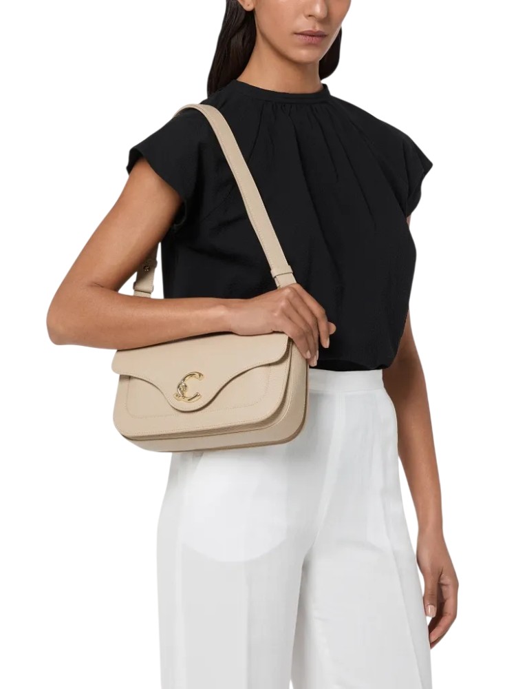 Una nuova signature entra a far parte del brand, Coccinelle C-Me. Il logo reinterpretato attraverso la C di Coccinelle che si annoda e abbraccia il plettro, elemento iconico del brand, un'unione che si intreccia con la vita di una donna tra passato e presente. Le linee geometriche e le curve sofisticate rafforzano il design, mentre la costruzione a soffietti aggiunge un tocco di funzionalità e delicata eleganza a questa borsa che vuole essere la compagna essenziale della donna Coccinelle durante la sua giornata. Questo modello è realizzato in pelle lavorata tramite specifici macchinari e poi bottalata al fine di mantenerne la morbidezza. È una pelle molto resistente che si presta a una facile pulizia, ideale per un uso quotidiano.