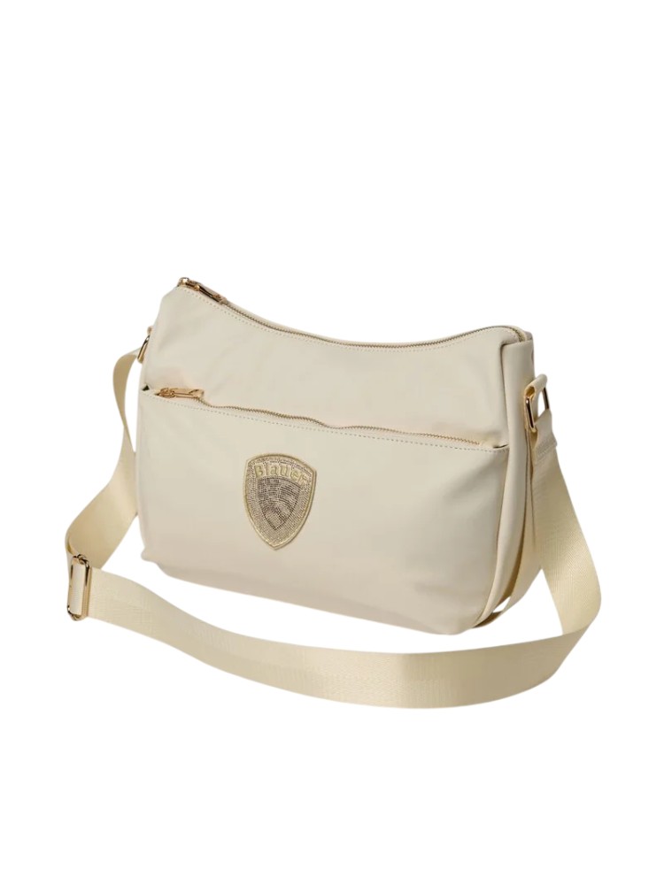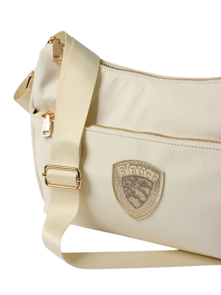 Elegante borsa a tracolla Blauer in nylon tecnico. Caratterizzata da una linea morbida, presenta una pratica tasca frontale zippata e un grande scudetto logato impreziosito da glitter. La tracolla in nastro regolabile e le rifiniture metalliche dorate la rendono un accessorio trendy e funzionale, perfetto per un uso quotidiano dinamico.